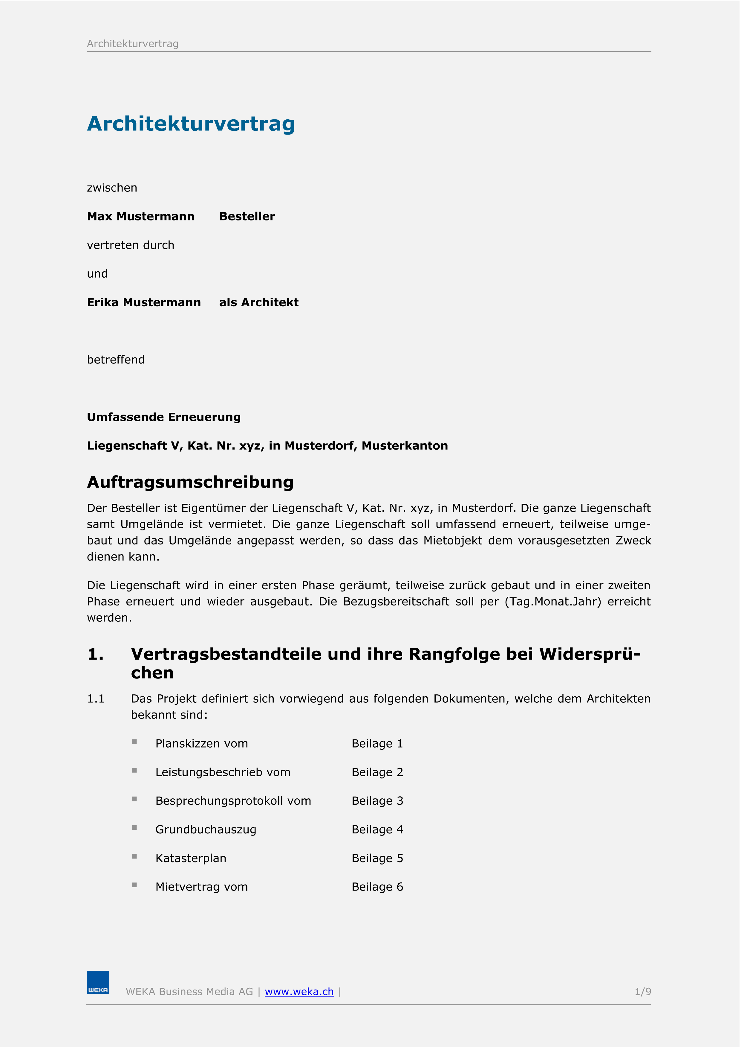 Der Architekturvertrag ist gesetzlich an keine Form gebunden. Es besteht grundsätzlich Formfreiheit. Sinnvoll und empfehlenswert ist es jedoch, jeden Architekturvertrag schriftlich auszuformulieren. Ein Architekturvertrag kann auch ohne SIA-Grundlage abgeschlossen werden. Er folgt diesfalls alleine den Regelungen des Obligationenrechts. Die SIA-Ordnung 102 erlangt nur Geltung, wenn dies vertraglich so vereinbart wurde. Profitieren Sie von dieser Mustervorlage und erstellen Sie einen rechtssicheren Architekturvertrag in Rekordzeit.