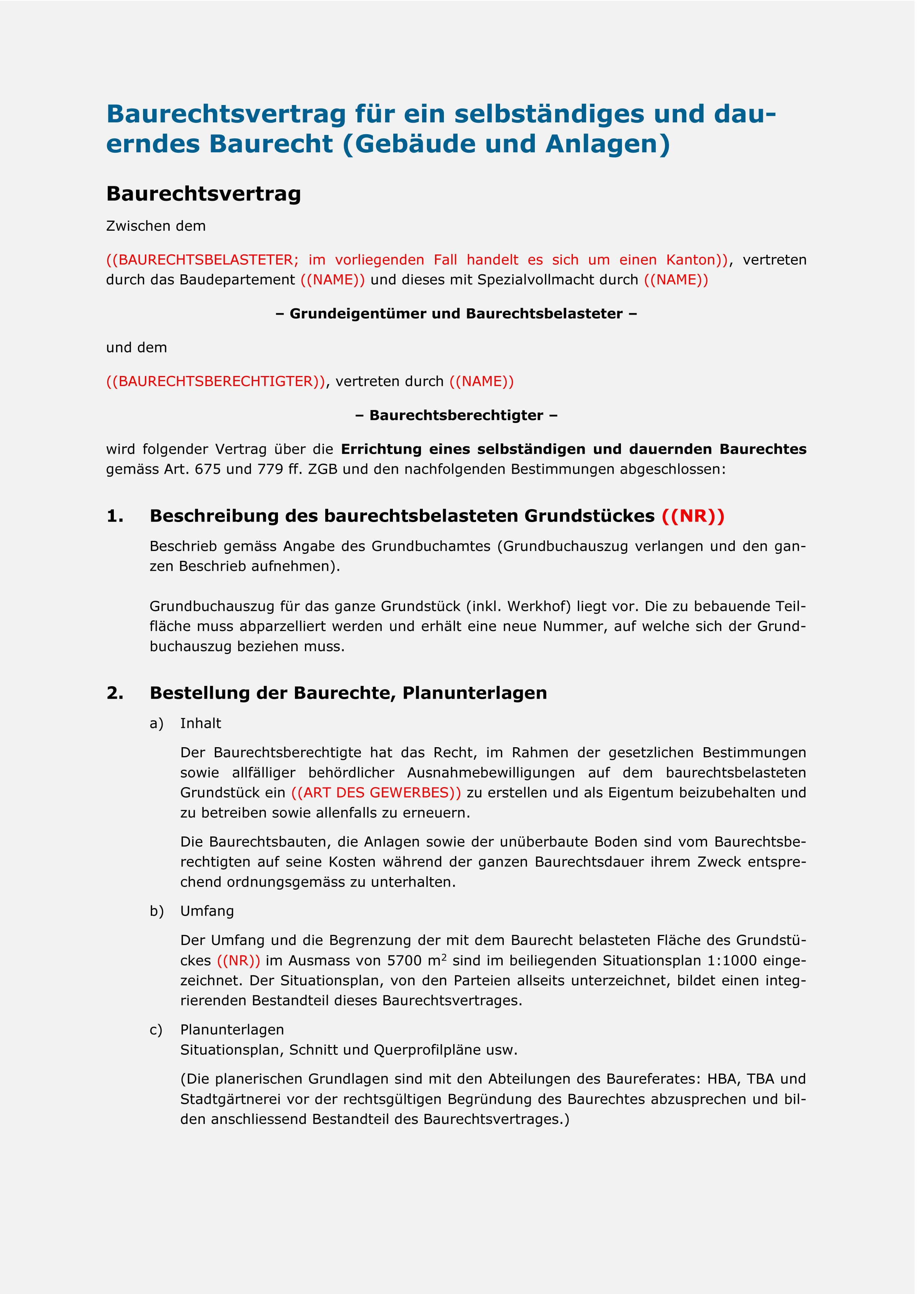 Die Formulierung eines Baurechtsvertrags ist sehr anspruchsvoll und die Konzipierung sollte sehr sorgfältig durchdacht werden, da das Gesetz den Vertragsparteien einen recht grossen Handlungsspielraum lässt. Nutzen Sie diese Vertragsvorlage, um auf einem fremden Grundstück rechtssicher eine Baute zu errichten oder beizubehalten.