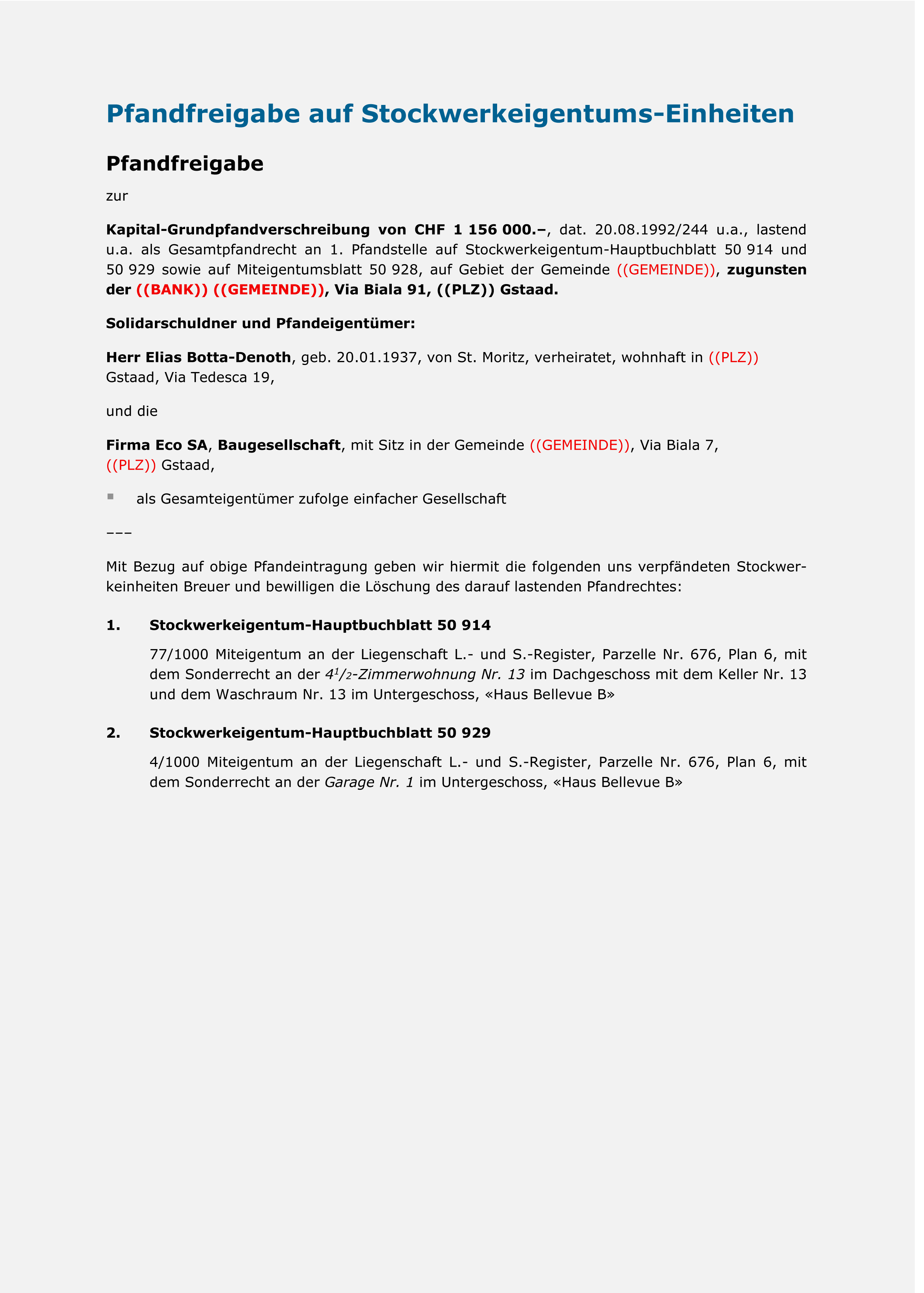 - Sie nutzen eine professionelle Vorlage, um die Stockwerkeinheiten aus der Pfandhaft des vorbezeichneten Grundpfandrechtes zu entlassen.