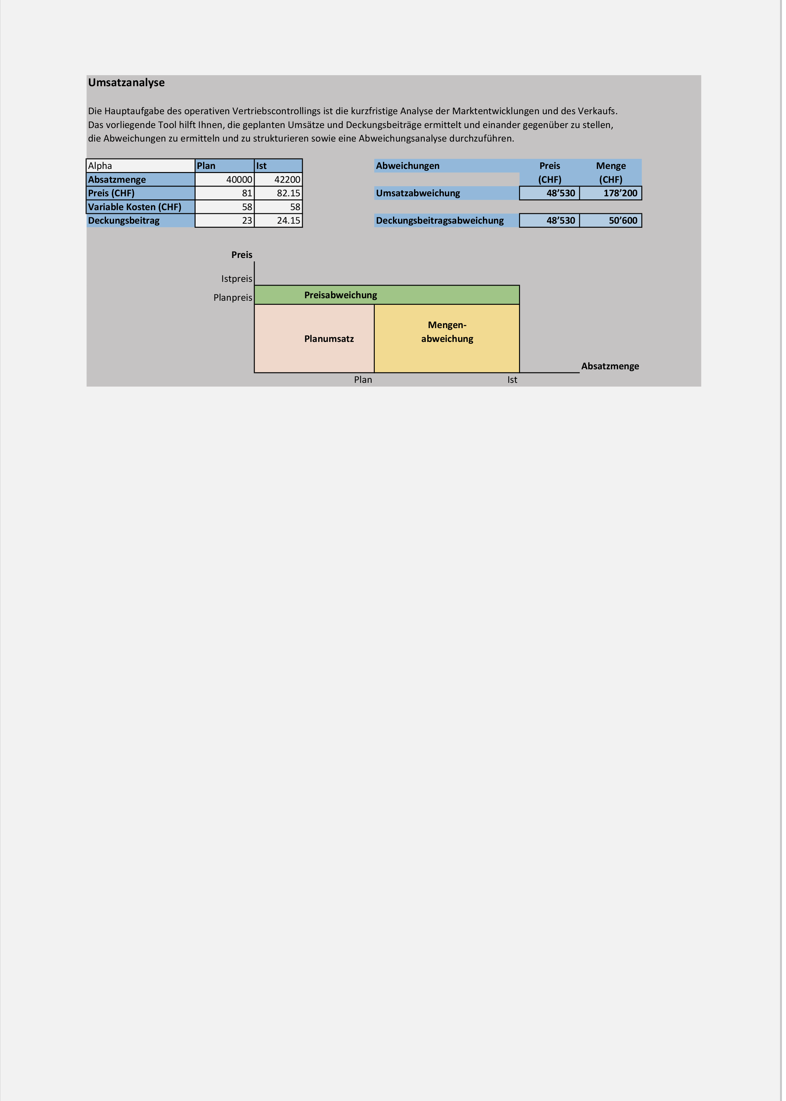 Das Umsatzanalyse-Tool unterstützt Ihr operatives Vertriebscontrolling. Sie erfassen Plan- und Ist-Werte für Absatzmenge, Preis und variable Kosten je Produkt. Das Tool berechnet Umsatz- und Deckungsbeitragsabweichungen und gliedert diese in Preis- und Mengenabweichung. Eine grafische Darstellung macht Abweichungen auf einen Blick sichtbar. So strukturieren Sie Ihre Abweichungsanalyse schnell und transparent.