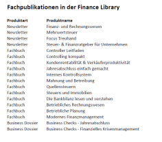 Die Aufgabengebiete im Finanz- und Rechnungswesen sind vielfältig und unterliegen laufenden Entwicklungen und gesetzlichen Änderungen. Finanzverantwortliche benötigen daher ein breites Fachwissen und müssen in allen Bereichen auf dem neusten Stand sein. Mit der Finance Library profitieren Sie von gesammeltem Fachwissen und Experten-Know-how für Ihre tägliche Arbeit im Finanz- und Rechnungswesen.