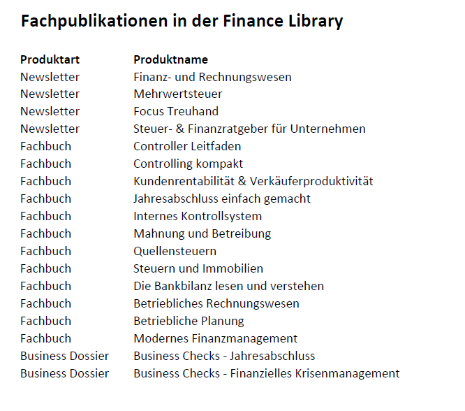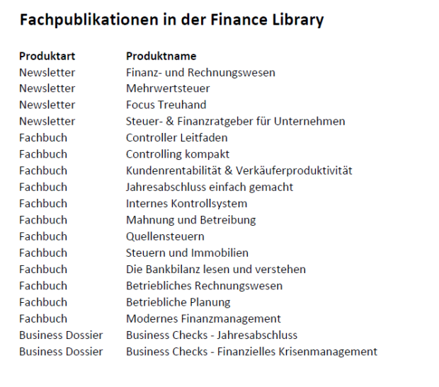 - Sie haben Online-Zugriff auf alle Fachpublikationen im Bereich Finanzen und Steuern (Newsletter, Fachbücher und Business Dossiers) mit praxisrelevanten Themen rund um Jahresabschluss, Mehrwertsteuer, Controlling und Steuern.