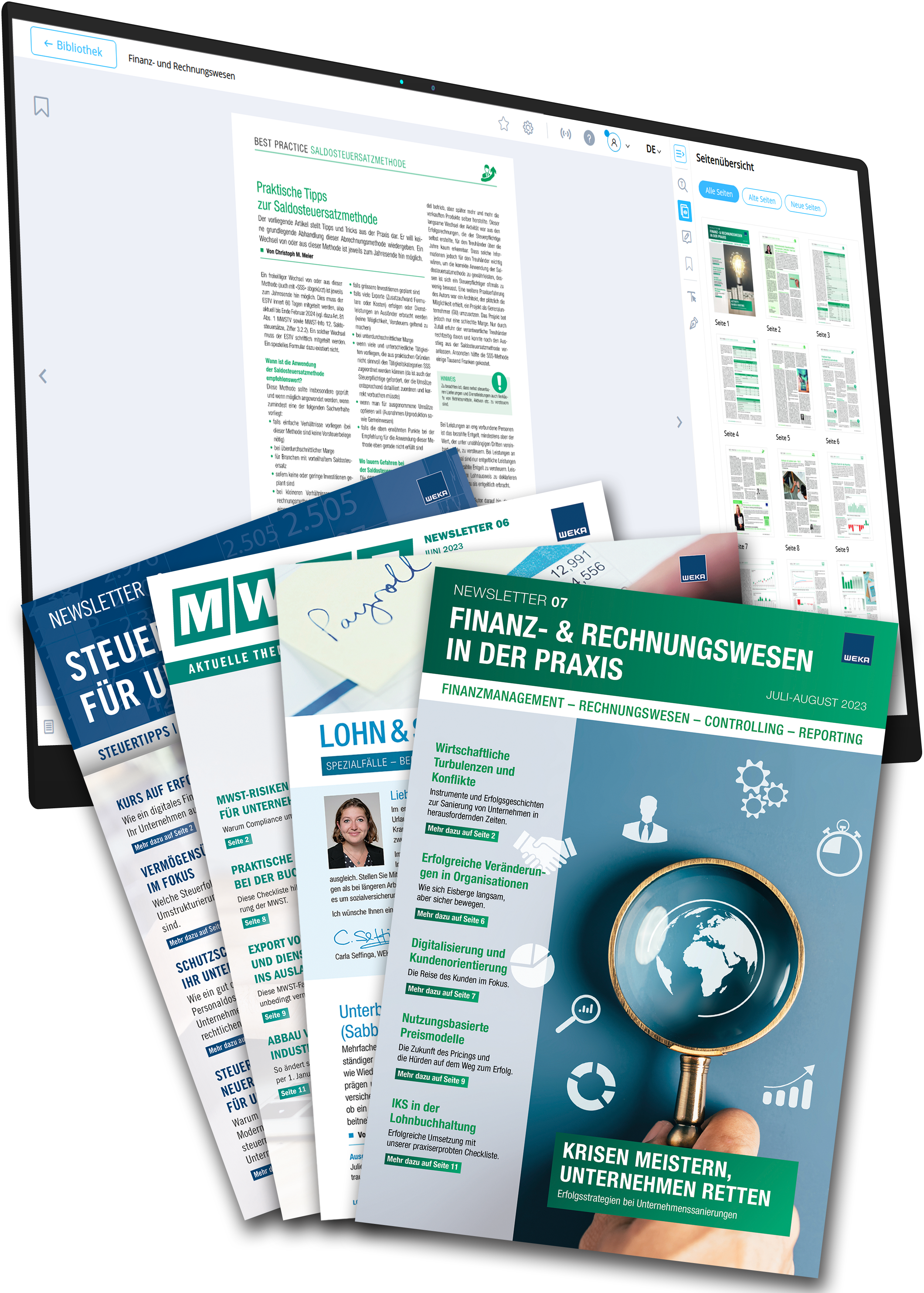 Sichern Sie sich jetzt die digitalen Ausgaben der vier Finanz-Newsletter «Finanz- und Rechnungswesen», «Mehrwertsteuer», «Steuer- und Finanzratgeber für Unternehmen» und «Lohn und Sozialversicherungen» im Paket und sparen Sie CHF 150.- im Vergleich zu den Einzel-Abonnements. So bleiben Sie in allen Bereichen auf dem Laufenden und verschaffen sich den entscheidenden Wissensvorsprung, der Sie in Ihrer Arbeit als Finanzverantwortliche/r voranbringt.
