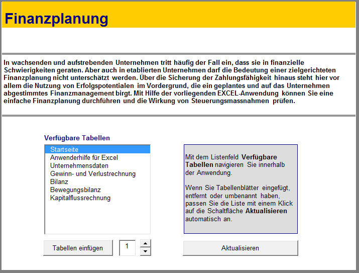 In wachsenden und aufstrebenden Unternehmen tritt häufig der Fall ein, dass sie in finanzielle Schwierigkeiten geraten. Aber auch in etablierten Unternehmen darf die Bedeutung einer zielgerichteten Finanzplanung nicht unterschätzt werden. Über die Sicherung der Zahlungsfähigkeit hinaus steht hier vor allem die Nutzung von Erfolgspotentialen im Vordergrund, die ein geplantes und auf das Unternehmen abgestimmtes Finanzmanagement birgt. Mit diesem Download-Paket erhalten Sie geeignete Excel-Tools als Hilfsmittel dafür.