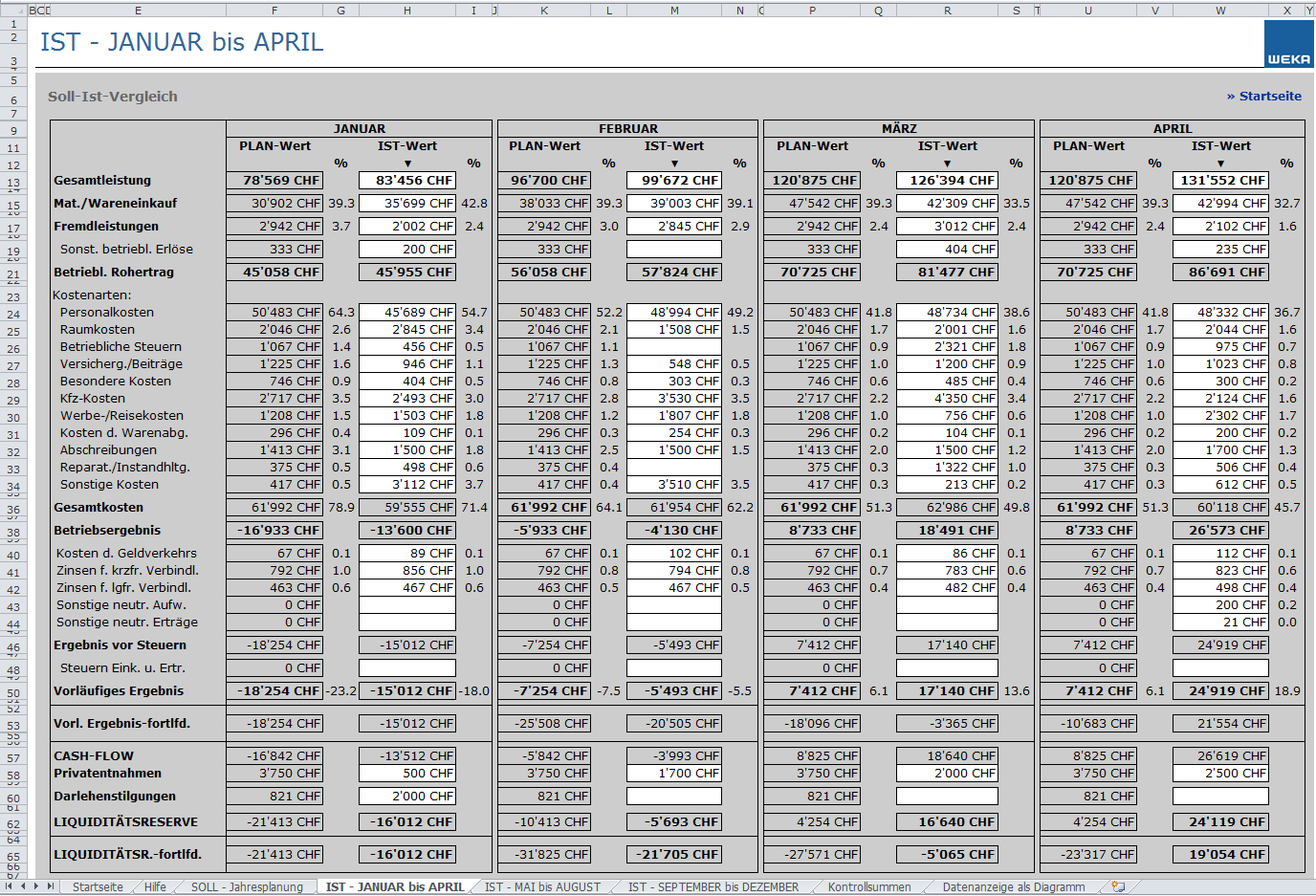 - Durch einen monatlichen Soll-/Ist-Vergleich ist es Ihnen möglich, ein effektives und zeitnahes Controlling durchzuführen, und zwar nicht nur bezüglich des Gesamtergebnisses sondern auch bezüglich einzelner Ertrags- und Kostenpositionen.