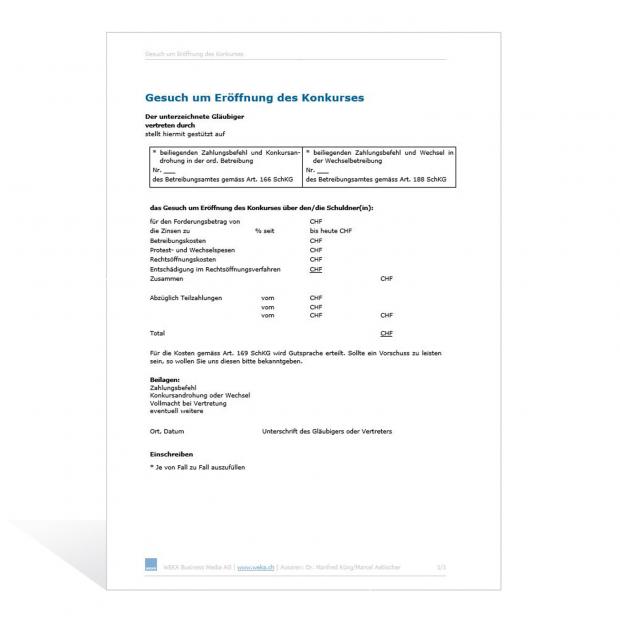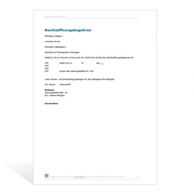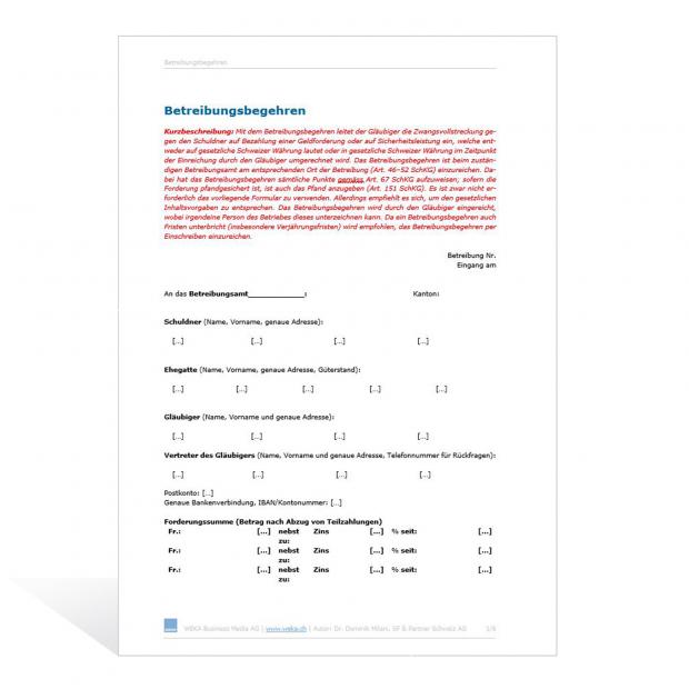 In diesem Download-Paket finden Sie von Schweizer Anwälten geprüfte Mustervorlagen wie Betreibungsbegehren, Fortsetzungsbegehren, Rechtsöffnungsbegehren, Verwertungsbegehren, Konkursandrohung, Gesuch um Eröffnung des Konkurses sowie eine Checkliste zu den Fristen des Betreibungsprozesses. So sparen Sie Zeit und Aufwand bei der Einleitung eines Betreibungsprozesses.