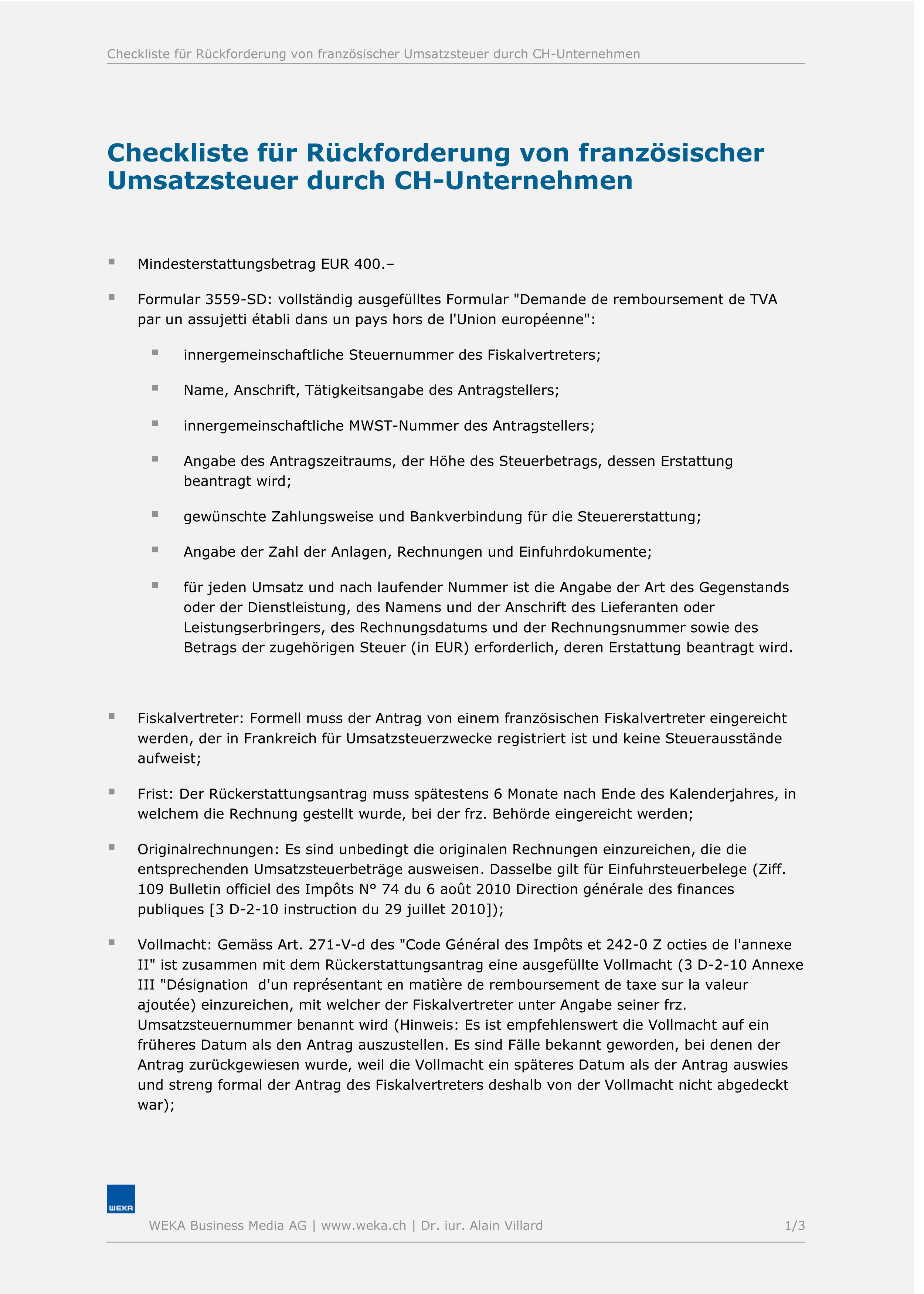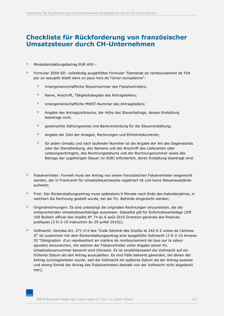- Checkliste – Rückforderung französischer Umsatzsteuer durch CH-Unternehmen