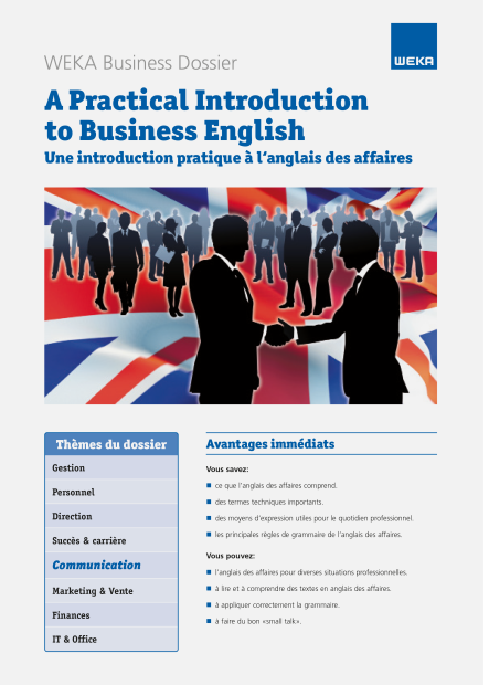 Sous l'influence de la mondialisation, la maîtrise de la langue anglaise et notamment de l'anglais des affaires (Business English) devient de plus en plus importante. Vous trouverez dans le présent dossier des locutions ainsi que des termes techniques utiles pour les différentes situations du quotidien professionnel - de l'entretien de téléphone au small talk, en passant par le voyage d'affaires.