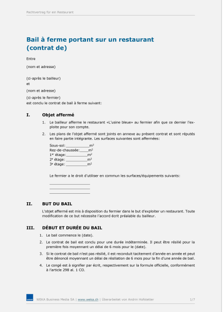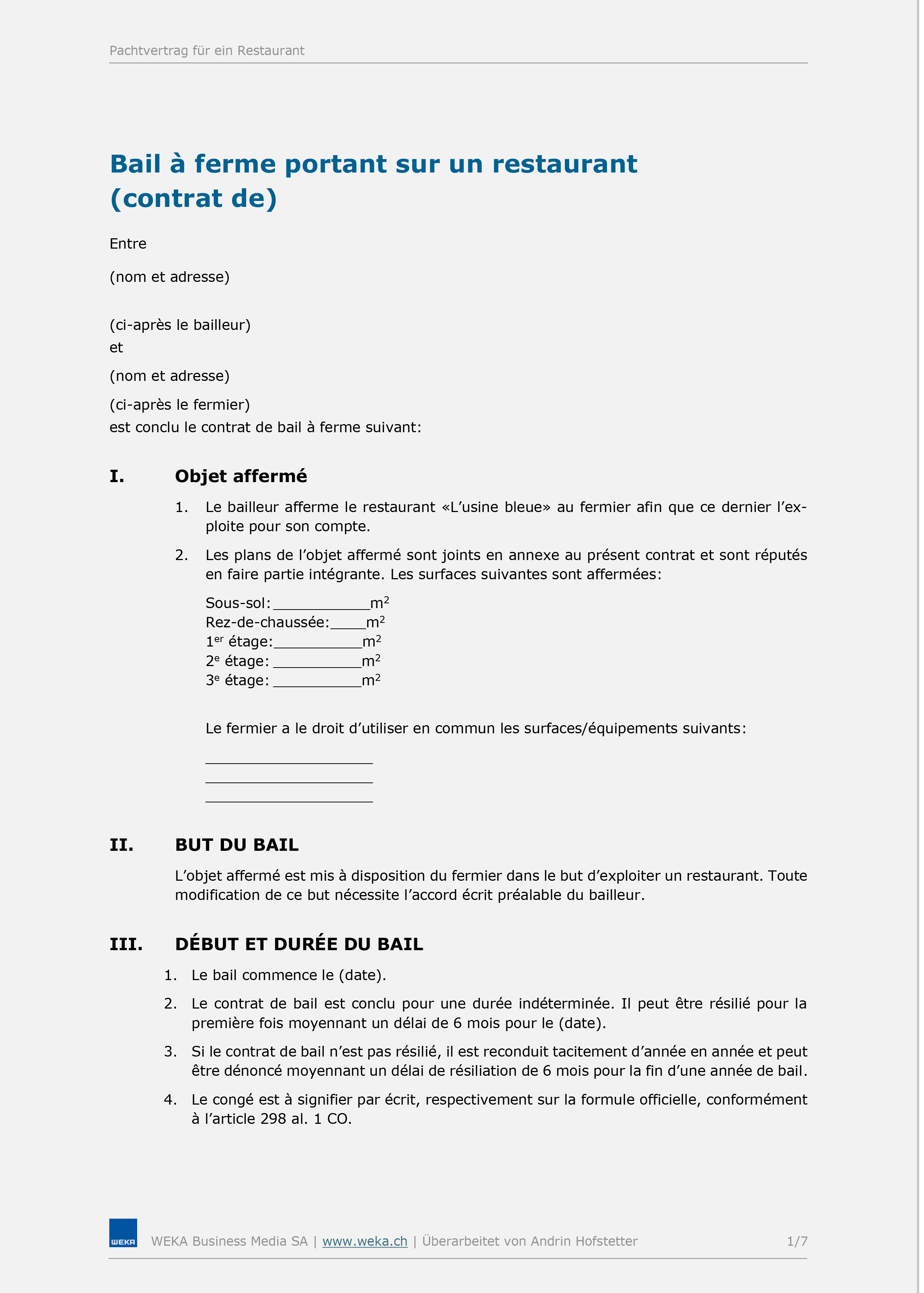 Le bail à ferme portant sur un établissement de restauration n’est soumis à aucune règle de forme. Pour des raisons de preuve, un contrat écrit est toutefois toujours recommandé. Le bail à ferme peut aussi être conclu par actes concluants, p.ex. lorsqu’un bail à ferme à durée déterminée est reconduit tacitement.
