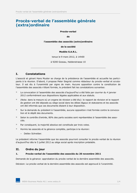 Un procès-verbal d'assemblée générale se justifie pour les raisons suivantes : assemblée de fondation et statuts, assemblée générale ordinaire, assemblée générale extraordinaire, assemblée générale universelle. Notre modèle vous aide dans tous ces cas.