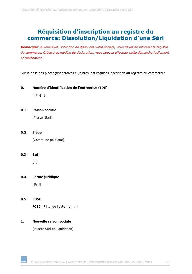 - Réquisition d’inscription au registre du commerce: Dissolution/Liquidation d’une Sàrl