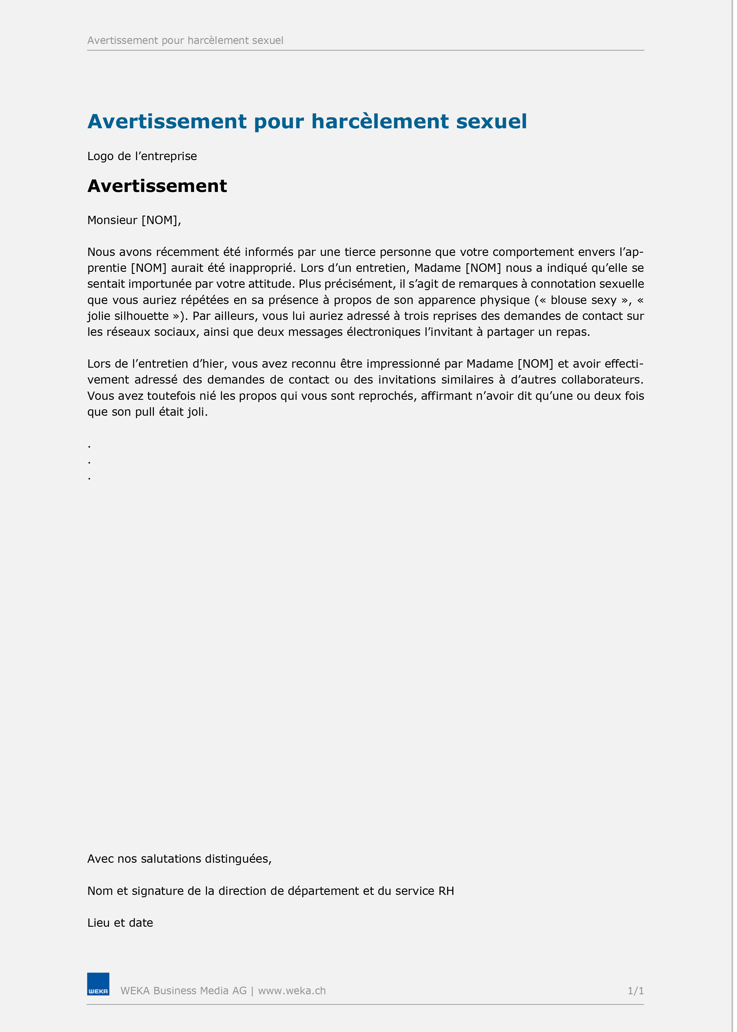 Une collaboratrice a signalé un comportement inapproprié de la part d’un collègue ? Le harcèlement sexuel en entreprise exige une réaction rapide, claire et juridiquement fondée. Ce modèle vous aide à formuler un avertissement officiel et conforme au droit du travail suisse, tout en sécurisant la procédure interne.