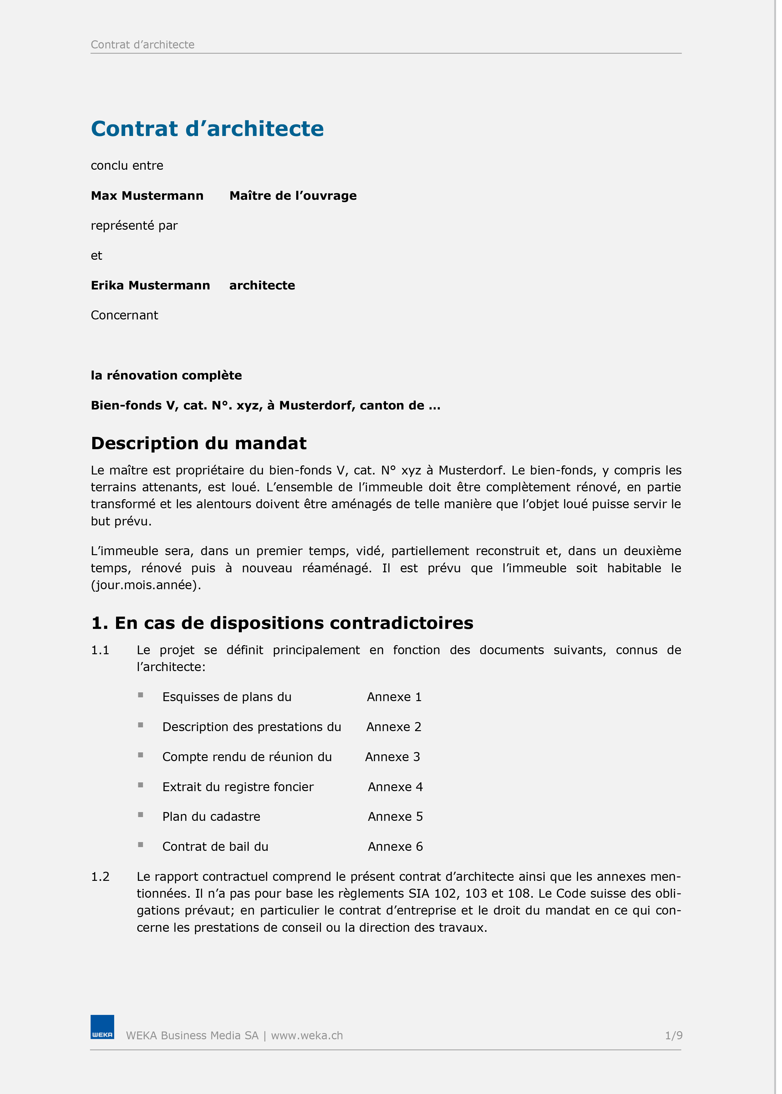 Le contrat d’architecte n’est soumis à aucune exigence formelle légale. Il règne en principe la liberté de forme. Il est toutefois judicieux et vivement recommandé de formaliser chaque contrat d’architecte par écrit. Un contrat d’architecte peut également être conclu sans se fonder sur les normes SIA. Dans ce cas, seules les dispositions du Code des obligations s’appliquent. La norme SIA 102 ne déploie ses effets que si elle a été expressément convenue par contrat. Profitez de ce modèle type pour établir un contrat d’architecte juridiquement sûr en un temps record.