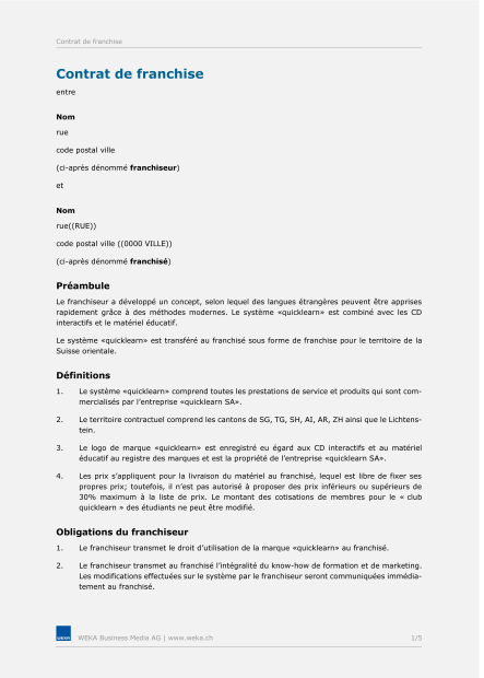 Il est recommandé de conclure le contrat de franchise par écrit, au mieux avec ce modèle de contrat.