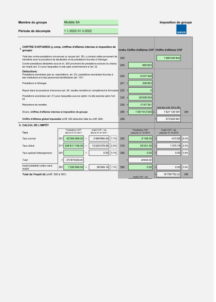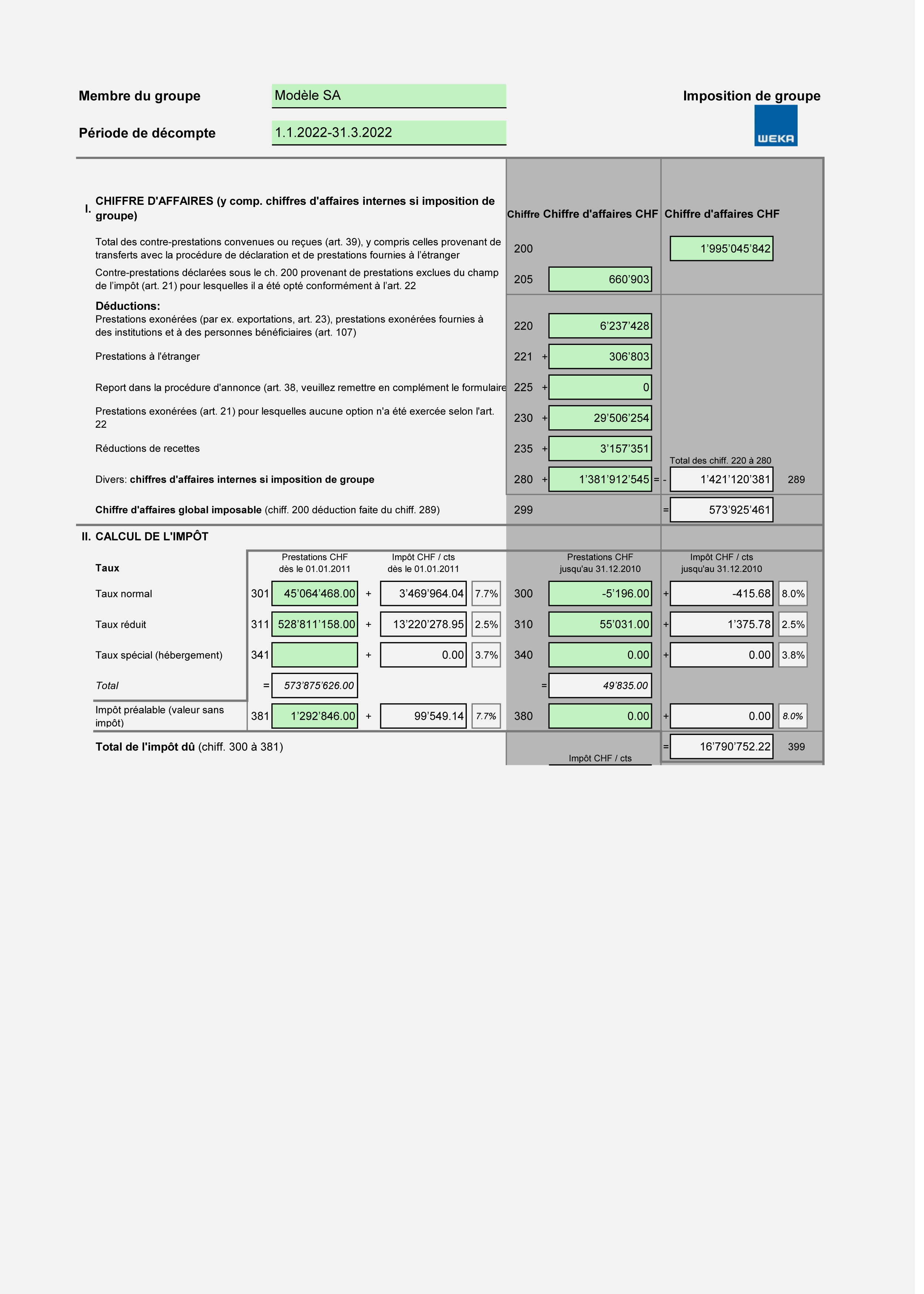 Ce téléchargement vous donne des axes de réflexion par rapport à des problématiques spécifiques en matière d’imposition de groupe et contient certains contrôles de vraisemblance. Il ne s’agit pas du formulaire officiel destiné aux assujettis qui est à remplir et à remettre à l’AFC pour la déclaration de la TVA. Seuls les formulaires déposés sur Internet par l’AFC sont valables à cet effet.