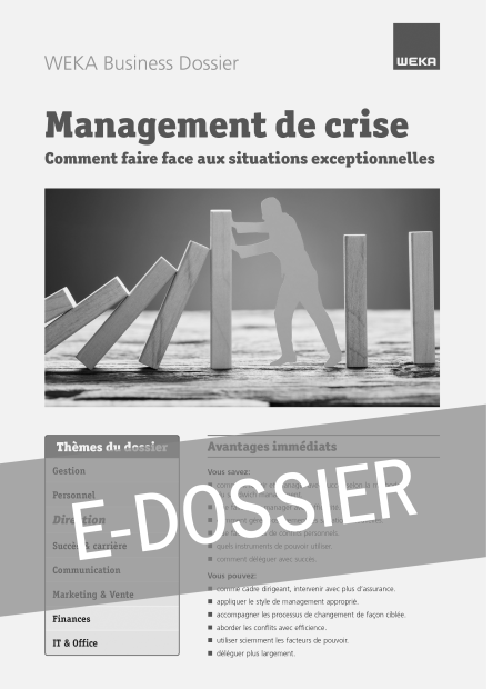 Lorsque vous réfléchissez à l’évolution de votre activité journalière de cadre dirigeant, vous constatez à l’évidence que bien des changements sont intervenus ces dernières années. Les exigences de performance ont progressé dans tous les domaines. Ce E-Dossier vous explique comment, en tant que dirigeant(e), vous pourrez maîtriser les sept situations les plus complexes et faire face efficacement aux défis quotidiens.