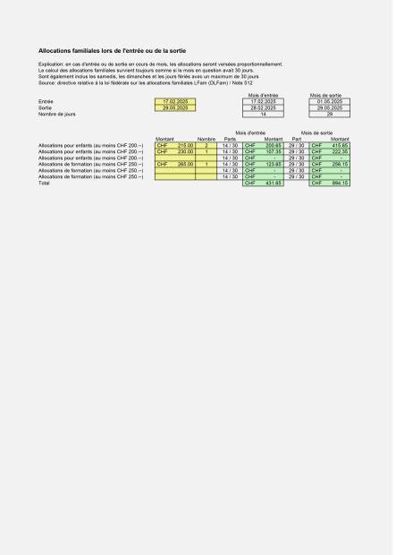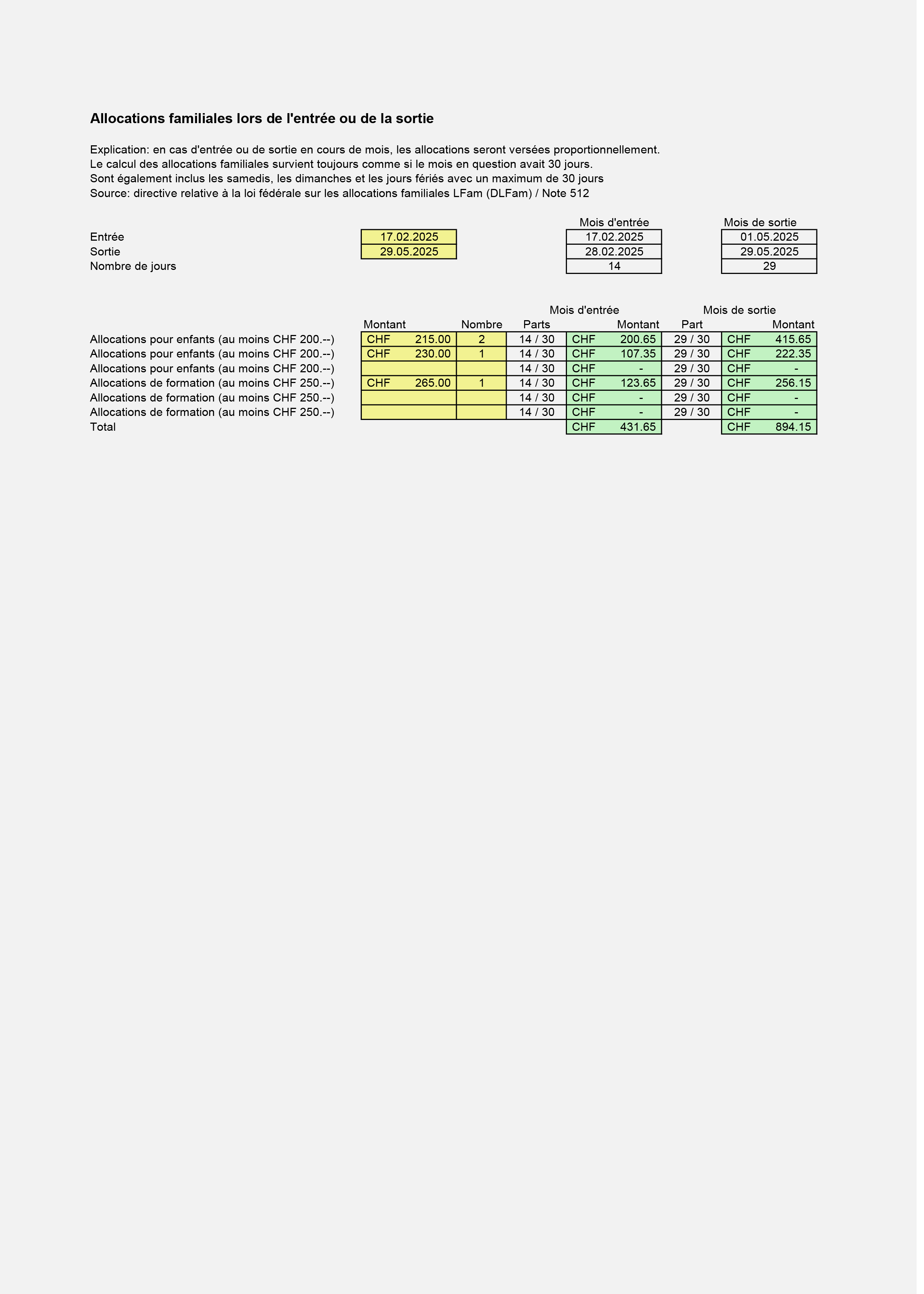 Les allocations familiales visent à compenser une partie des frais que doivent assumer les parents pour l’entretien de leurs enfants. En cas d'entrée ou de sortie d’un collaborateur au cours d'un mois, les allocations sont versées au prorata. Le calcul des allocations familiales survient toujours comme si le mois en question avait 30 jours.