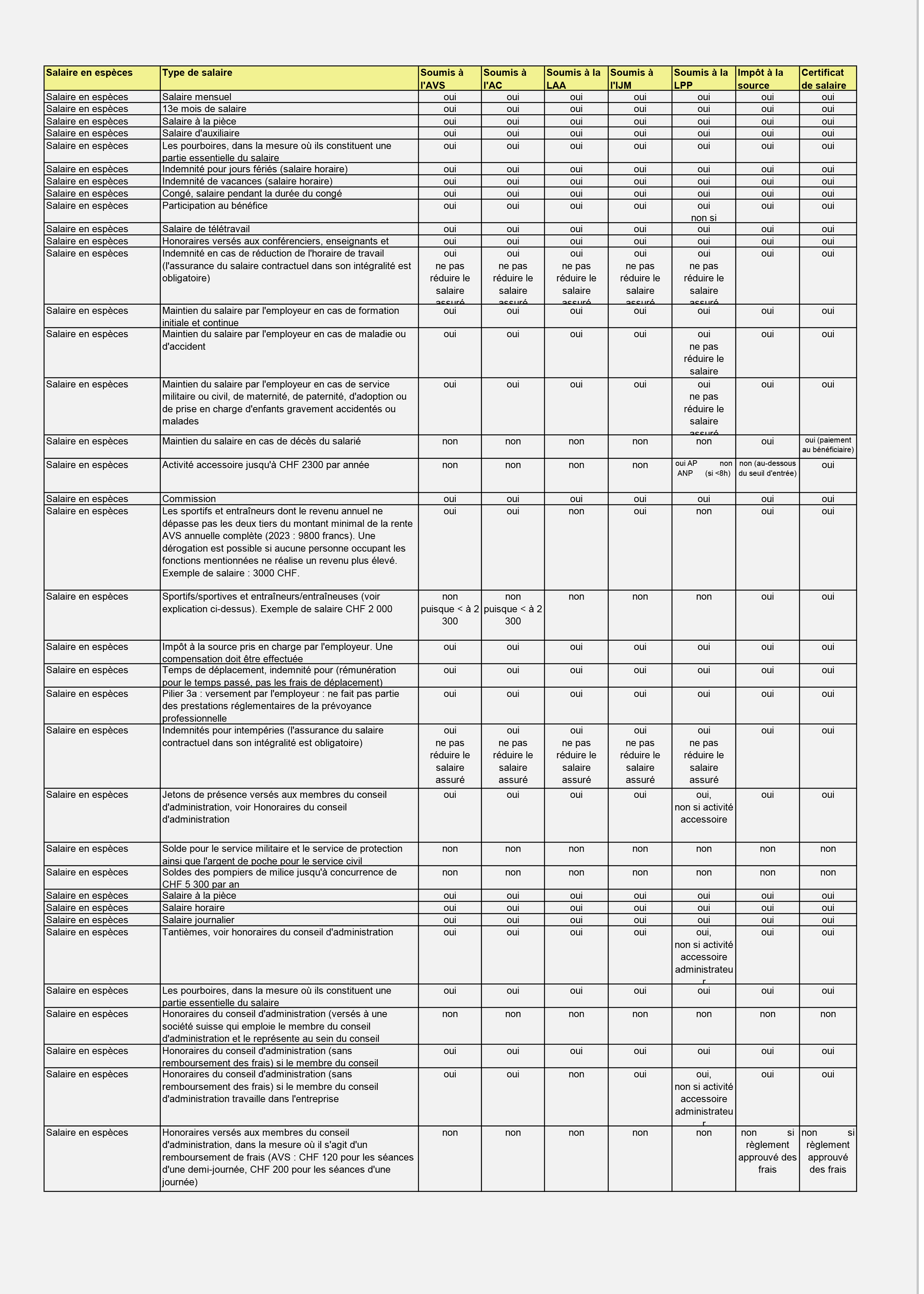 Cette aide pratique vous guide dans l’exécution et le contrôle de la correcte imputation des différentes composantes de salaire. Elle vous offre une vue claire de toutes les obligations liées aux principales rubriques salariales et indique si elles doivent être reportées dans le certificat de salaire. Vous identifiez immédiatement si une composante est soumise à l’AVS, à l’AC, à la LAA, aux indemnités journalières maladie (IJM) ou à la LPP, et si elle doit être prise en compte dans le certificat de salaire ou l’impôt à la source