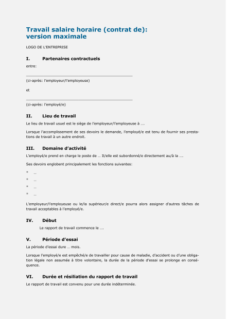Le contrat de travail contient l'ensemble des dispositions régissant les rapports entre l'employeur et l'employé. Vous disposez d'une grande marge de manœuvre, dans la mesure où les dispositions légales minimales sont respectées. Nous vous proposons ici la version maximale d'un contrat de travail avec salaire horaire.