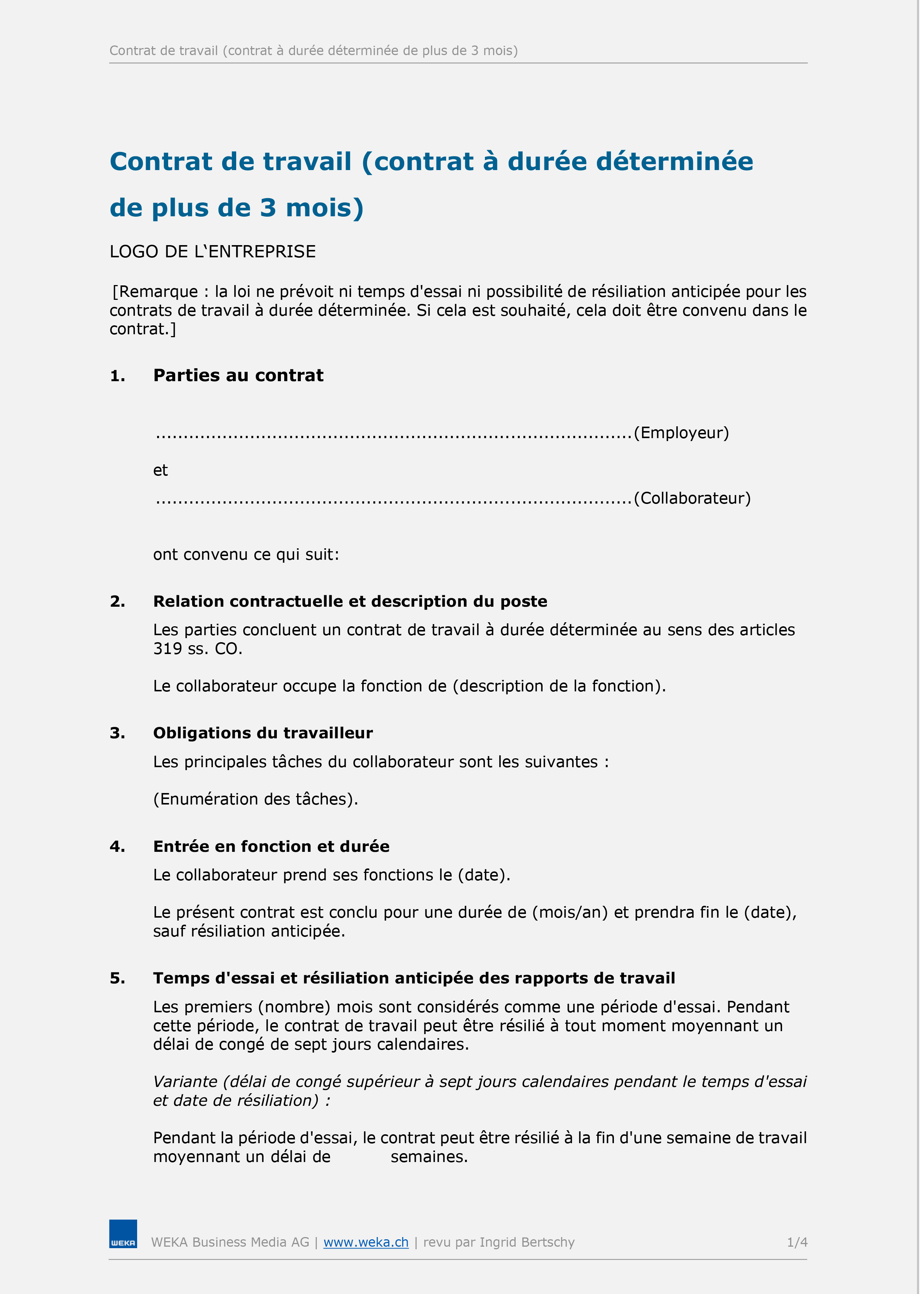 Modèle d’un contrat de travail limité dans le temps (plus de 3 mois).