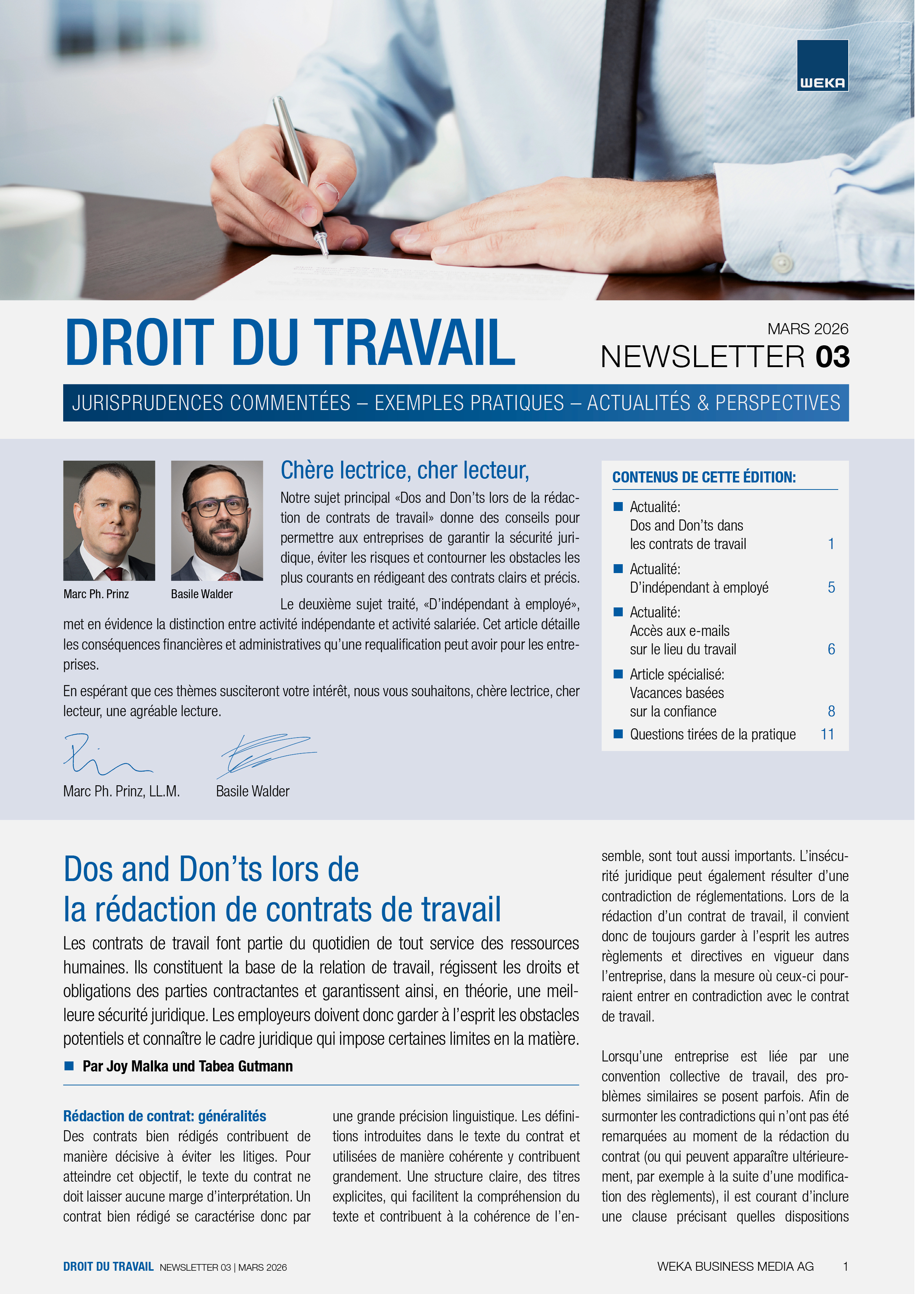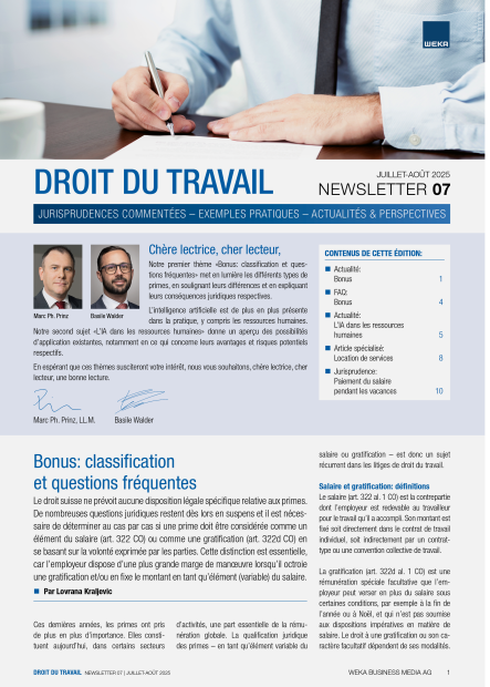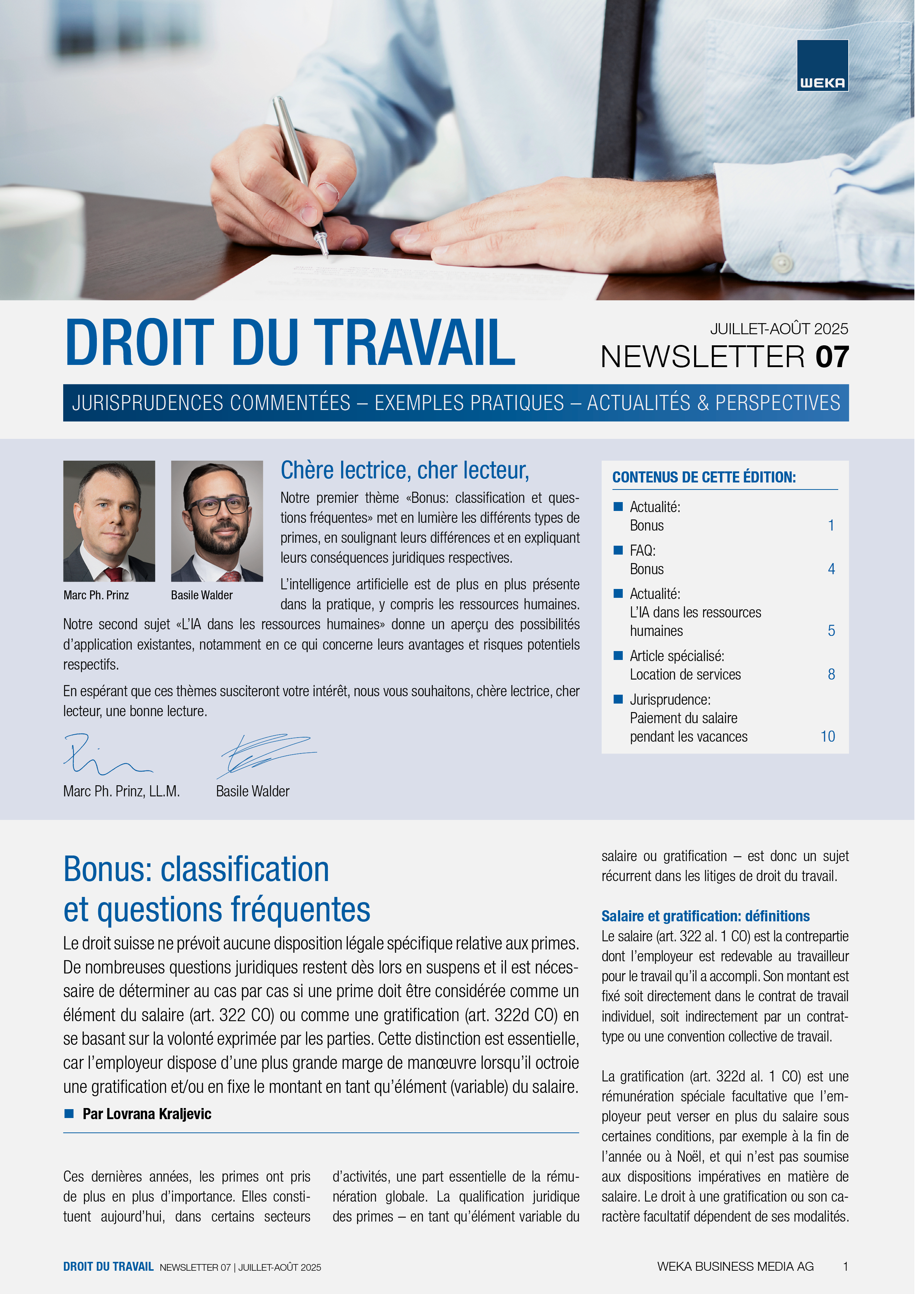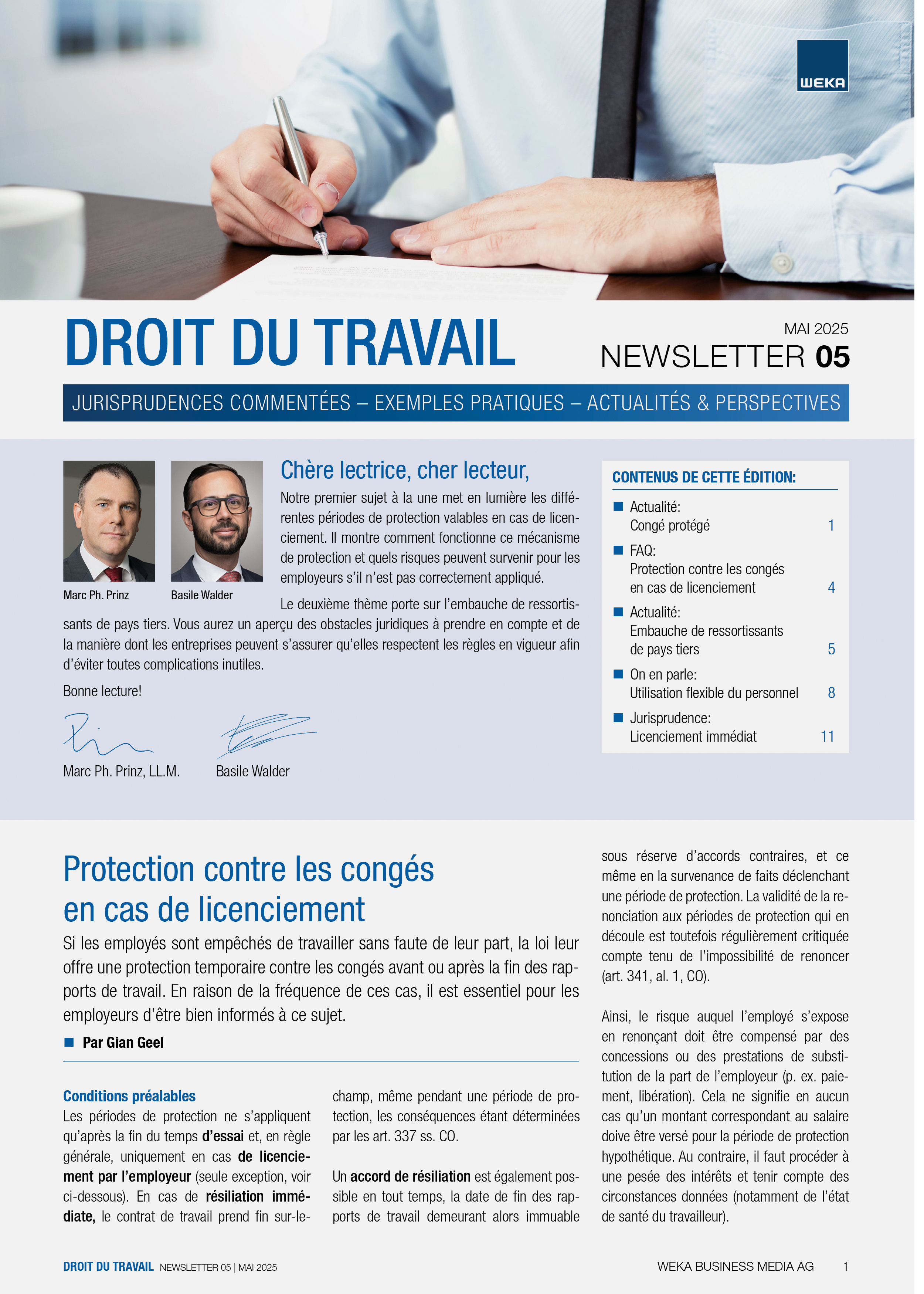 Avec la Newsletter Droit du travail, élaborée par des spécialistes renommés du domaine, vous bénéficiez 10 fois par an d’informations fondées et concrètes sur le droit du travail. Vous êtes ainsi toujours au fait de l'actualité et profitez d'un maximum informations fondées et concrètes sur le droit du travail.
