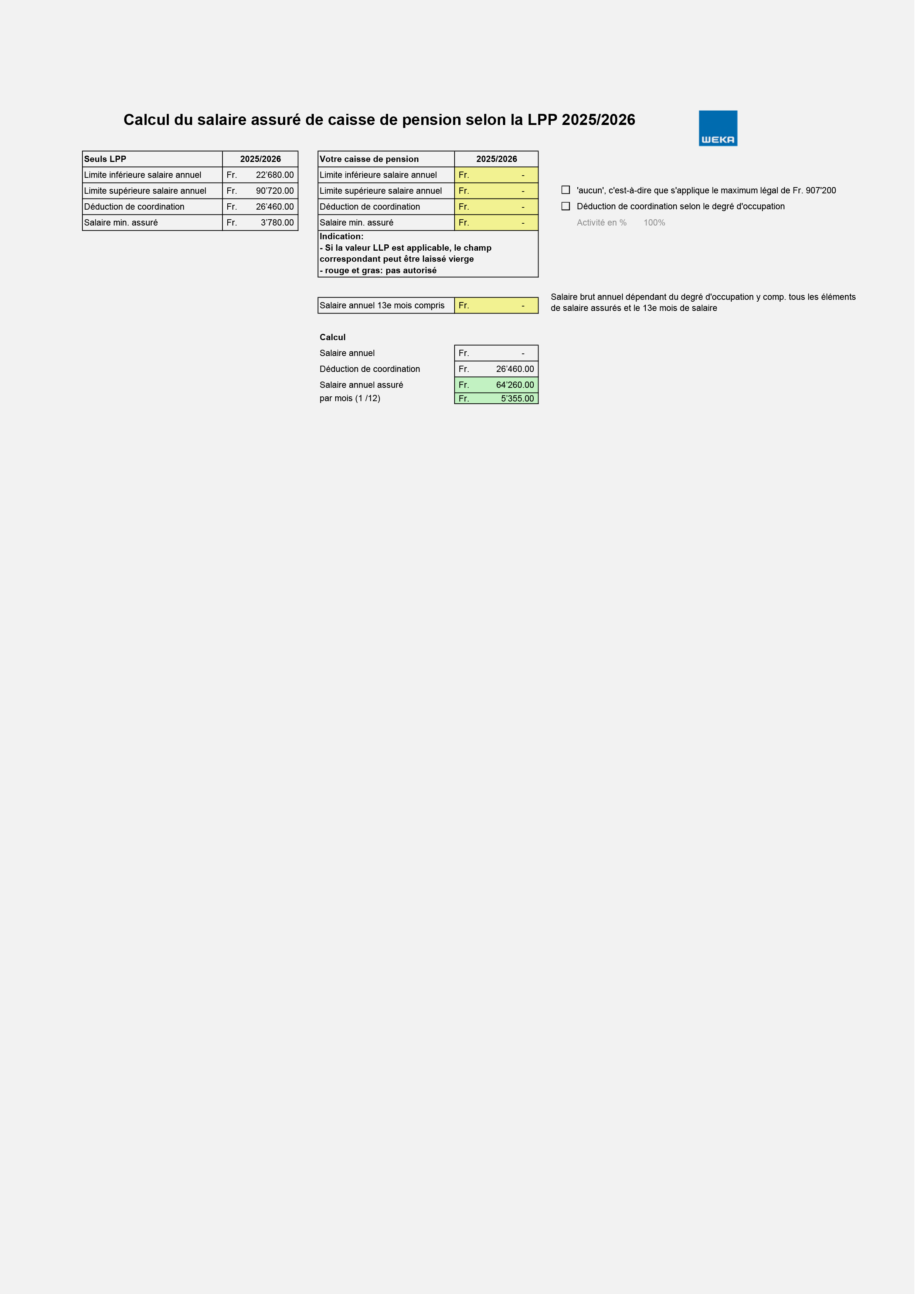 Ce téléchargement vous permet de calculer le salaire assuré de caisse de pension selon la LPP (état 2025). Vous pouvez l’adapter selon vos besoins et, si vous le souhaitez, calculer une déduction de coordination en fonction du taux d'occupation.