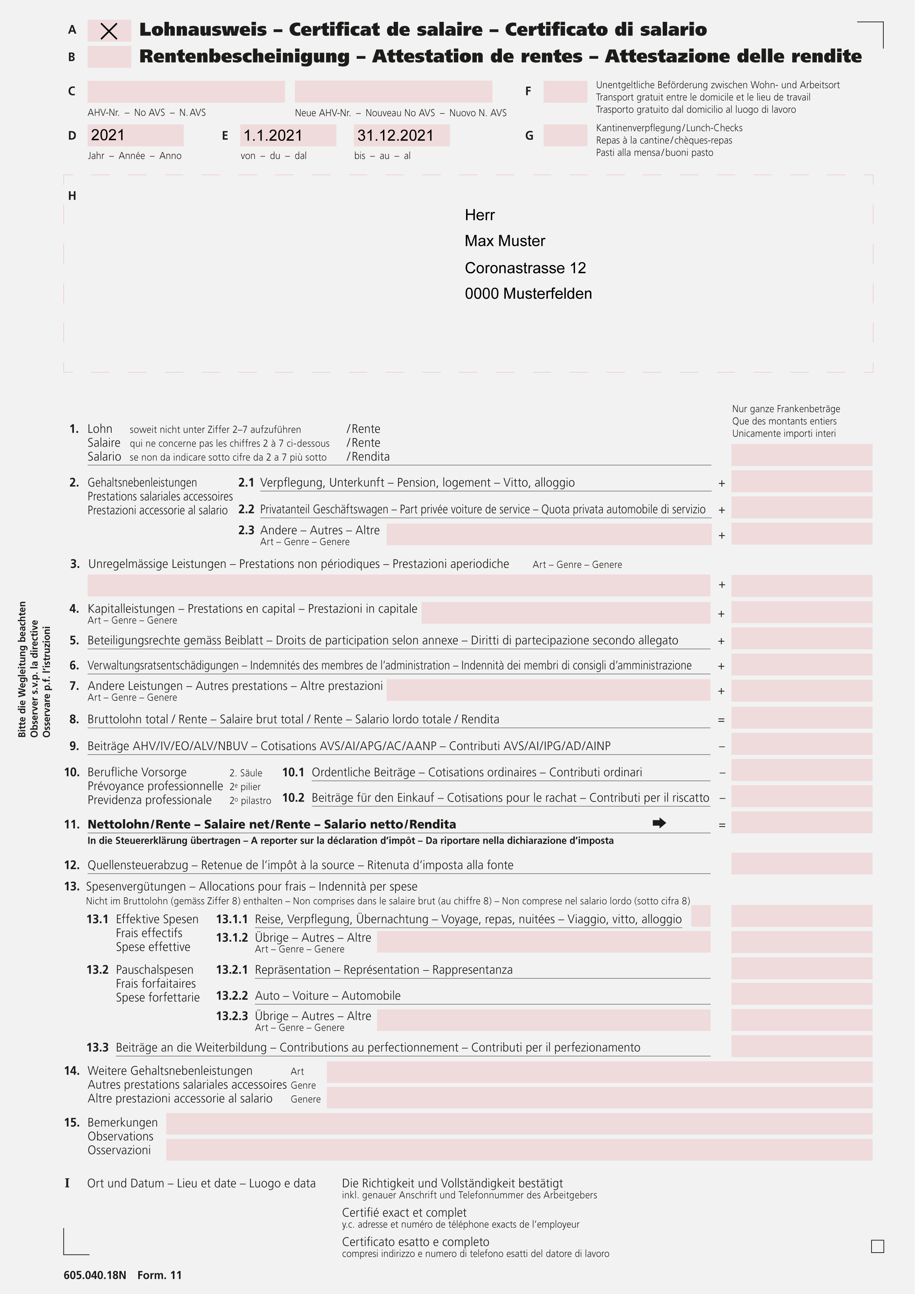 La pandémie du coronavirus et les mesures d’accompagnement de la Confédération ont influencé fortement la vie économique. Les certificats de salaires sont aussi touchés. Ce modèle commenté de solution indique à quels endroits réaliser des adaptations en fonction des évolutions constatées l’an passé.