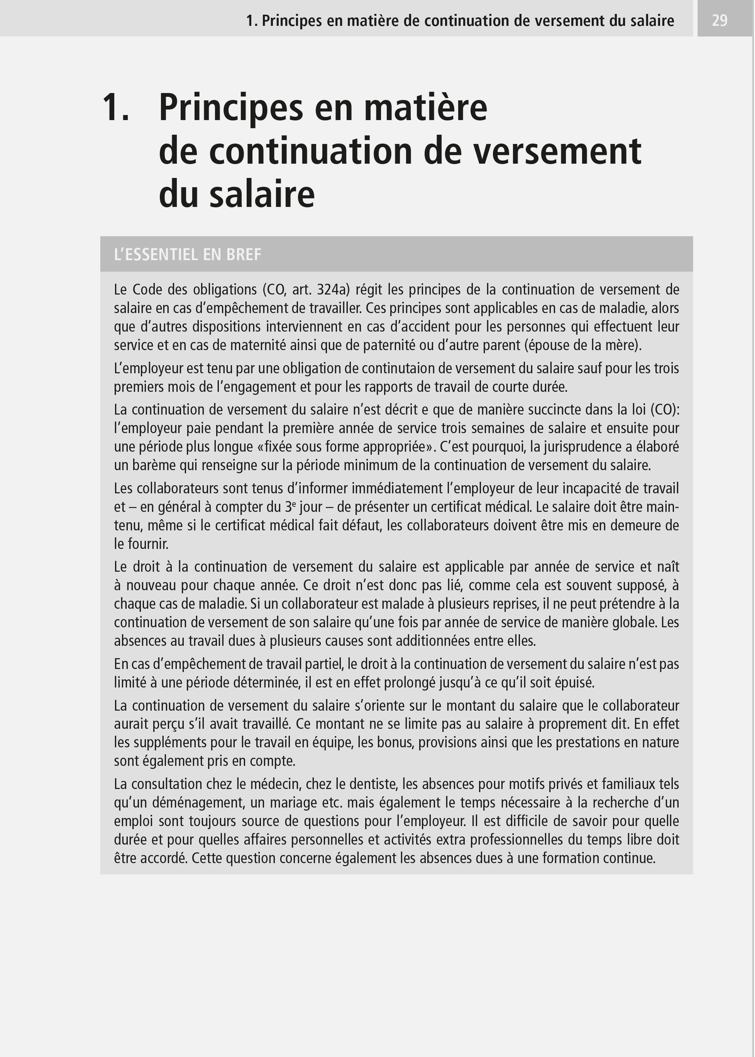 Le droit des obligations (CO, art. 324a) régit les principes du versement de salaire en cas d’empêchement de travailler. Le maintien du salaire n’est décrit que de manière succincte dans la loi (CO): l’employeur paie pendant la première année de service trois semaines de salaire et ensuite pour une période plus longue «fixée équitablement». Notre E-Dossier en format PDF vous renseigne sur les conditions de la poursuite du versement du salaire, ses bases légales et son application.