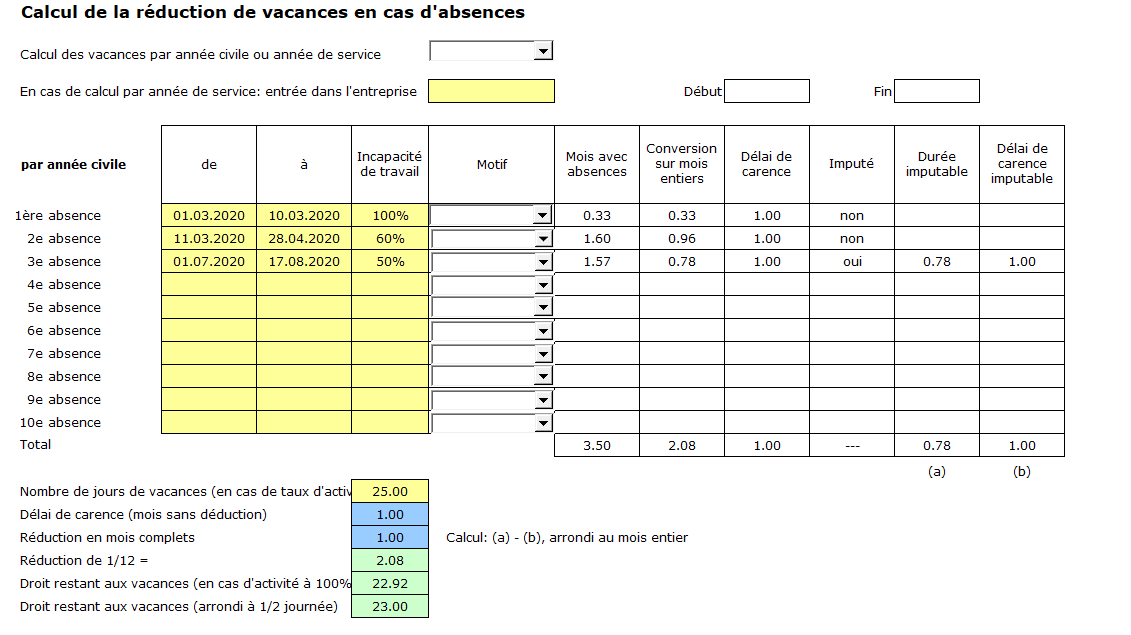 - Vous disposez d’un calculateur Excel permettant de prendre en compte les absences lors du calcul de la réduction des vacances.
