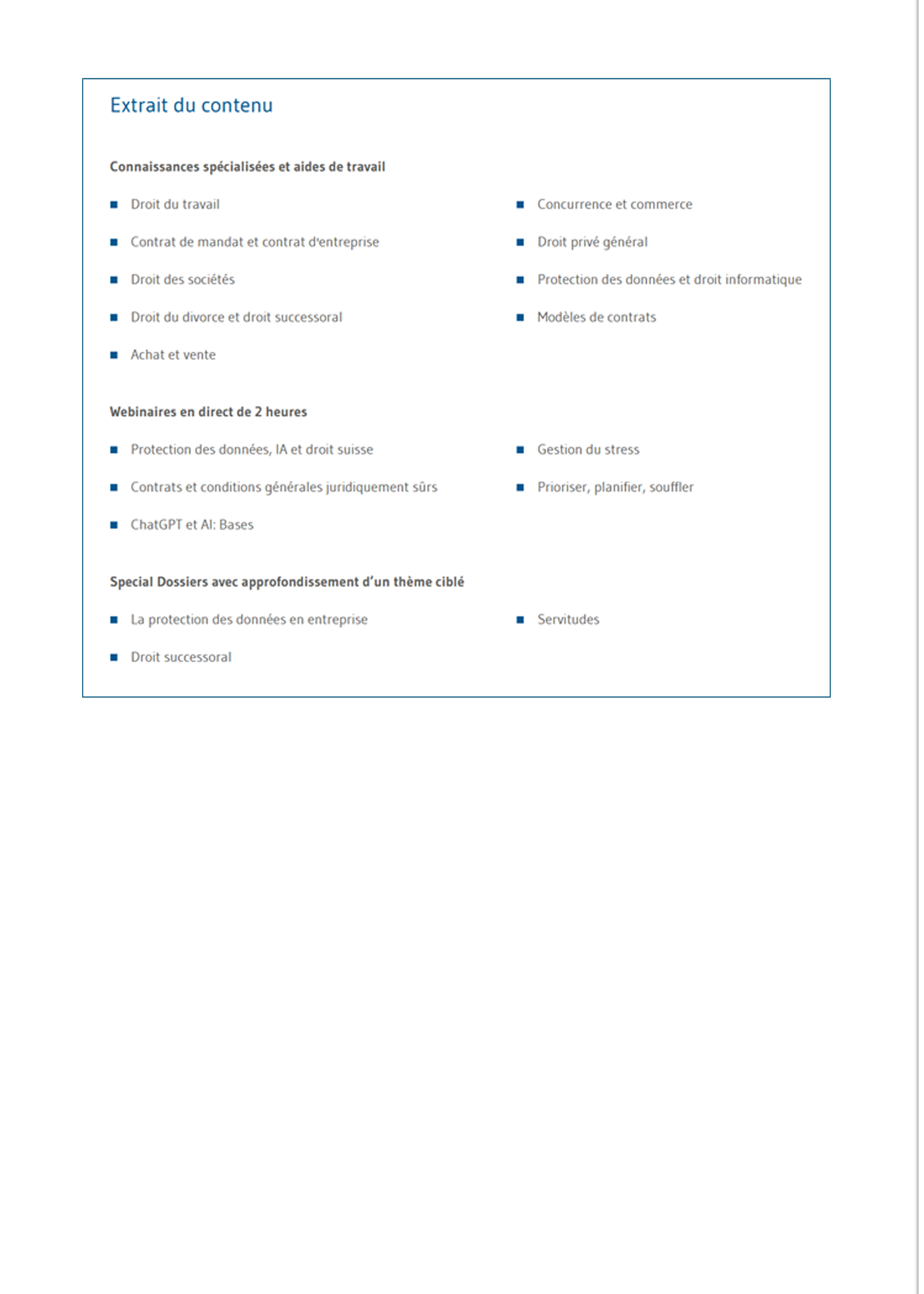 Grâce à ces contenus, vous travaillez de manière professionnelle et augmentez votre efficacité face aux différents défis de votre quotidien professionnel.