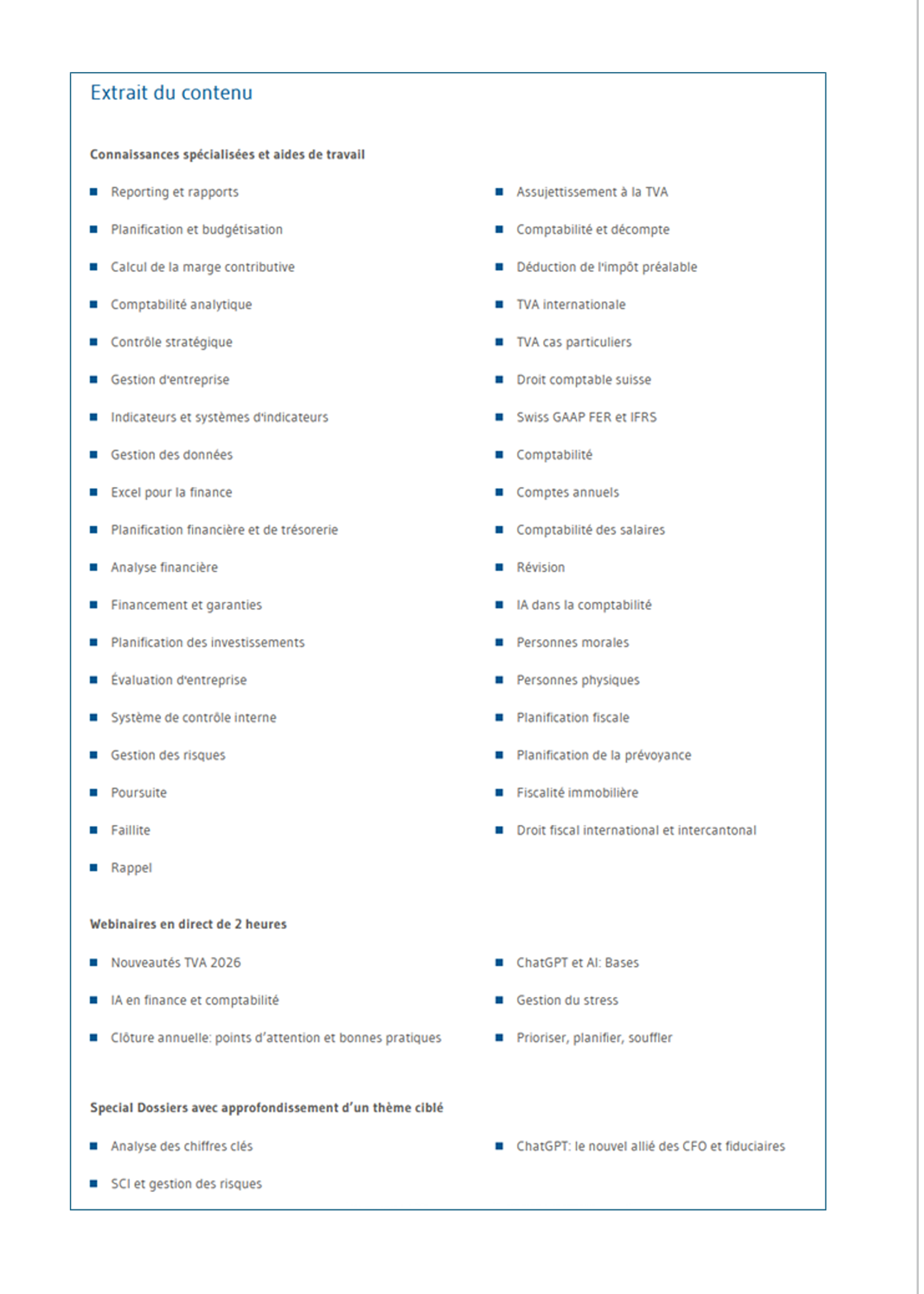 Pour votre travail quotidien, vous disposez également d'outils, de calculateurs, de listes de contrôle et de modèles testés et éprouvés, créés et mis à jour en permanence par des experts financiers suisses. Ceux-ci vous assistent dans l'analyse, la planification et la mise en œuvre et vous aident à rendre vos processus financiers plus rapides, plus structurés et plus sûrs.