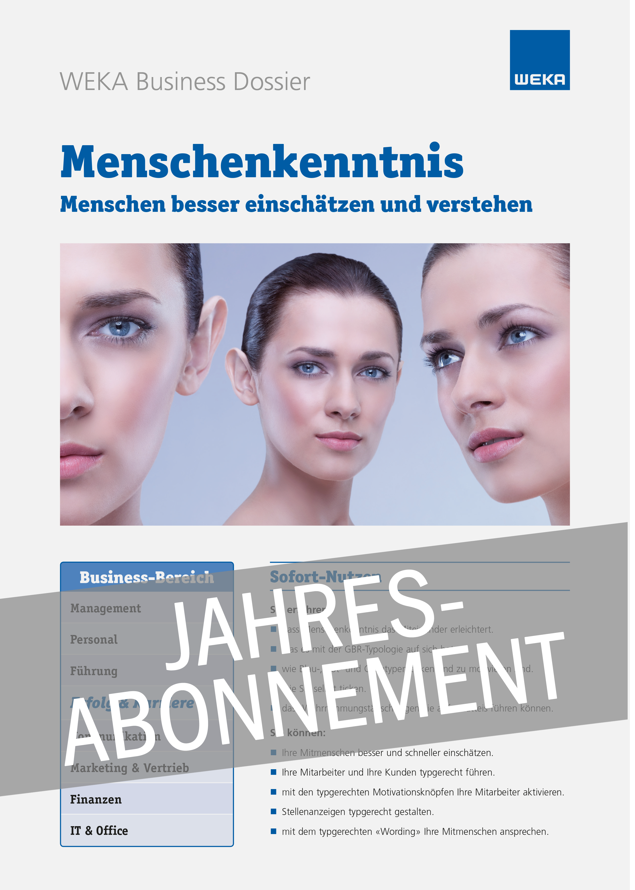 Schon lange heisst es: Wer in der Karriere weiterkommen will, braucht nicht nur Fachwissen, sondern auch die so genannten Soft Skills. Nicht umsonst gelten Networking, Selbstmanagement, Kommunikations- und Konfliktfähigkeit, Motivation, Emotionale Intelligenz, Menschenkenntnis und Co. als DIE Karrierebeschleuniger schlechthin. Die WEKA Business Dossiers bringen dieses Soft-Wissen klar auf den Punkt und unterstützen Sie dabei, sich von der Masse abzuheben. Sichern Sie sich Ihren Vorsprung!