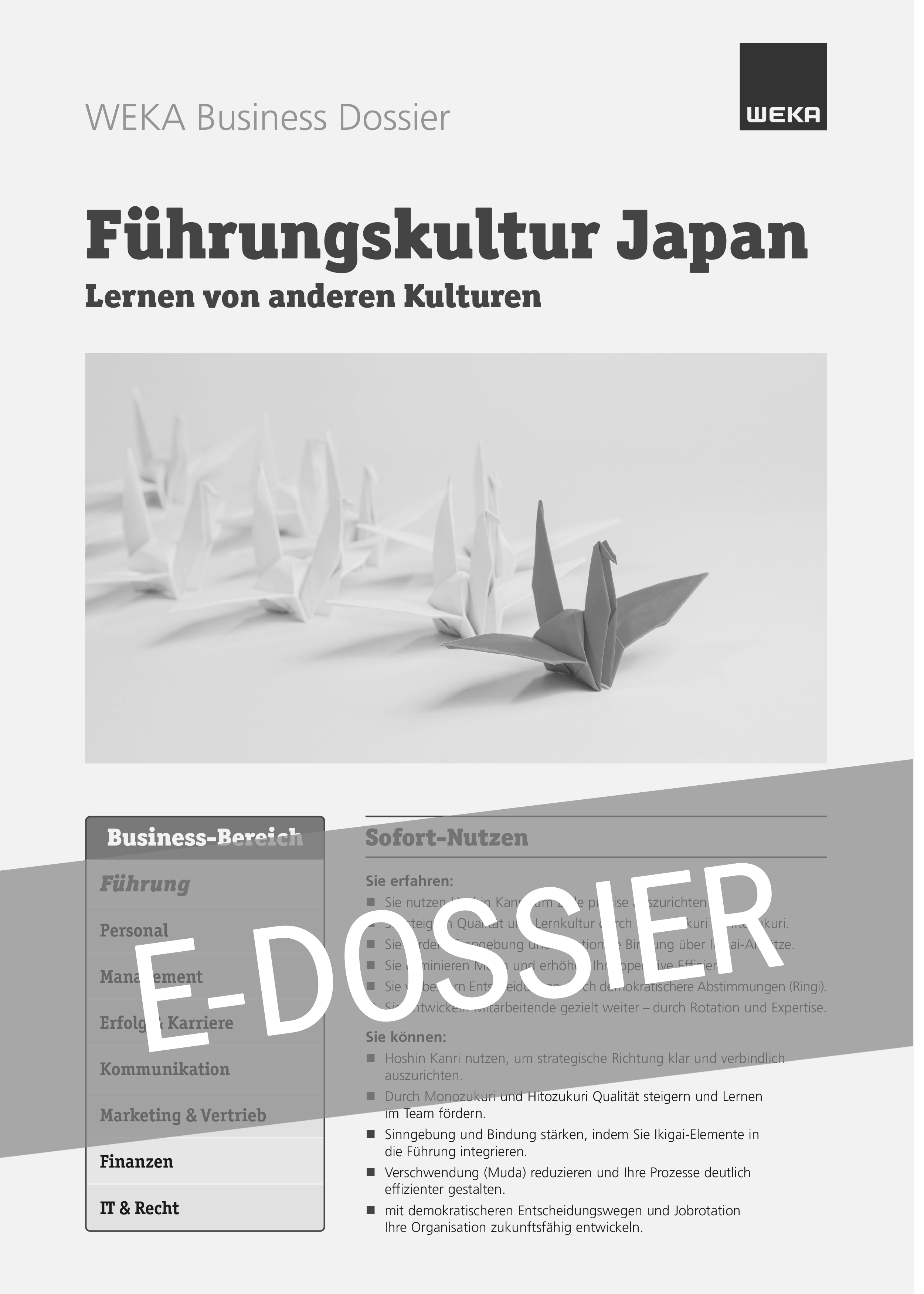 In diesem Business Dossier beleuchten wir «Hoshin Kanri», die japanische Kompass-Management-Methode und geben Einblicke in die Wirkungsweisen japanischer Unternehmen. Als Kernstück haben wir zehn Tipps erarbeitet mit der Überschrift: «Was wir von japanischer Personalführung lernen können». Wir untersuchen die Begriffe: Strategie, Sinn, Teamgedanke, Karrieren, Vorschlagswesen, Entscheidungen, Jobrotation, Informationsfluss, Löhne und Wissensmanagement.