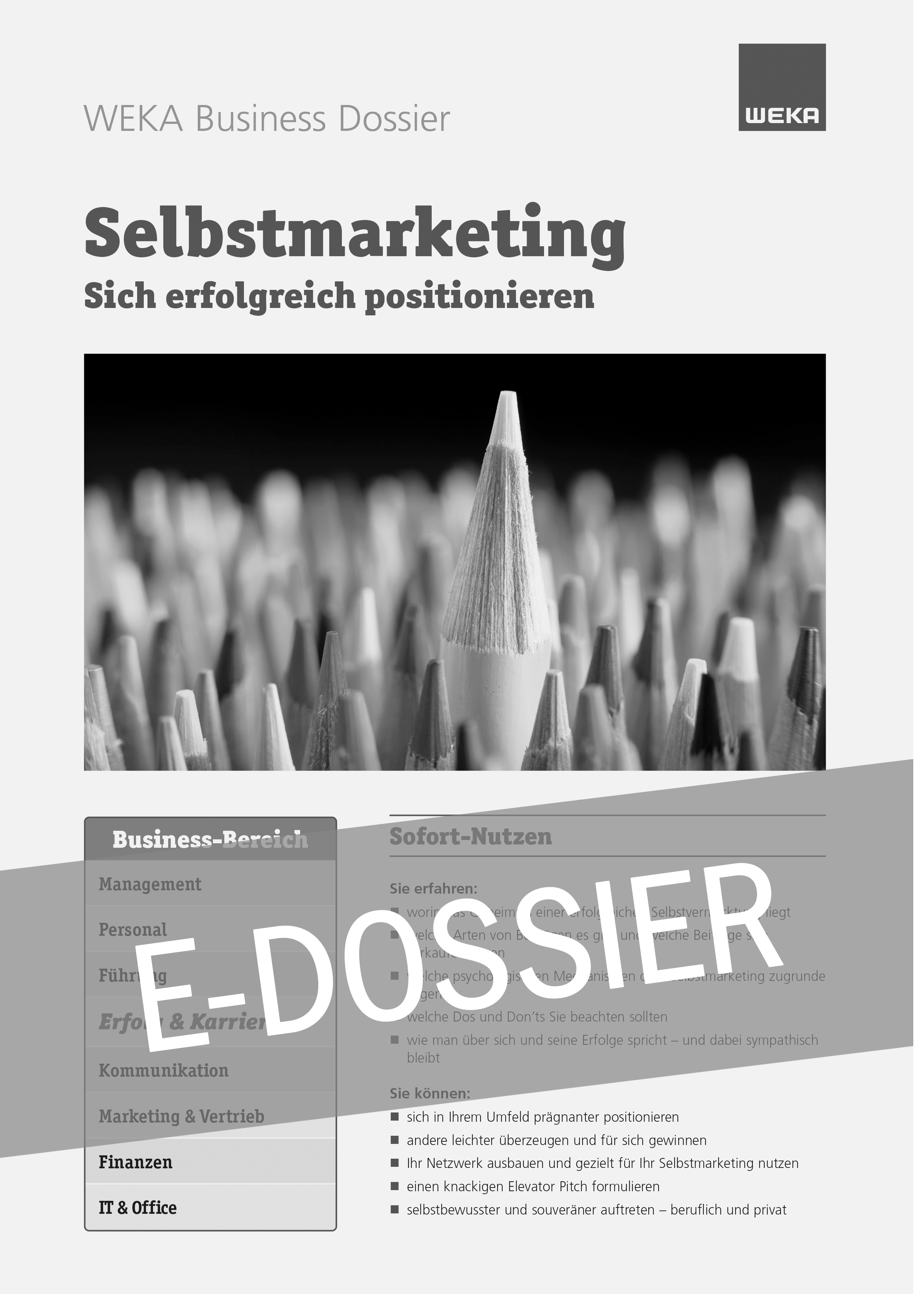 Durch die intensive Auseinandersetzung mit unseren starken Seiten macht uns das Selbstmarketing selbstbewusster, steigert unsere Motivation und unsere Freude an der Arbeit. Es gibt uns die Möglichkeit, unsere Talente und Fähigkeiten unter Beweis zu stellen, unsere Ideen einzubringen und zu verwirklichen. Sie möchten auch erfolgreiches Selbstmarketing praktizieren? Laden Sie jetzt dieses E-Dossier dazu herunter.