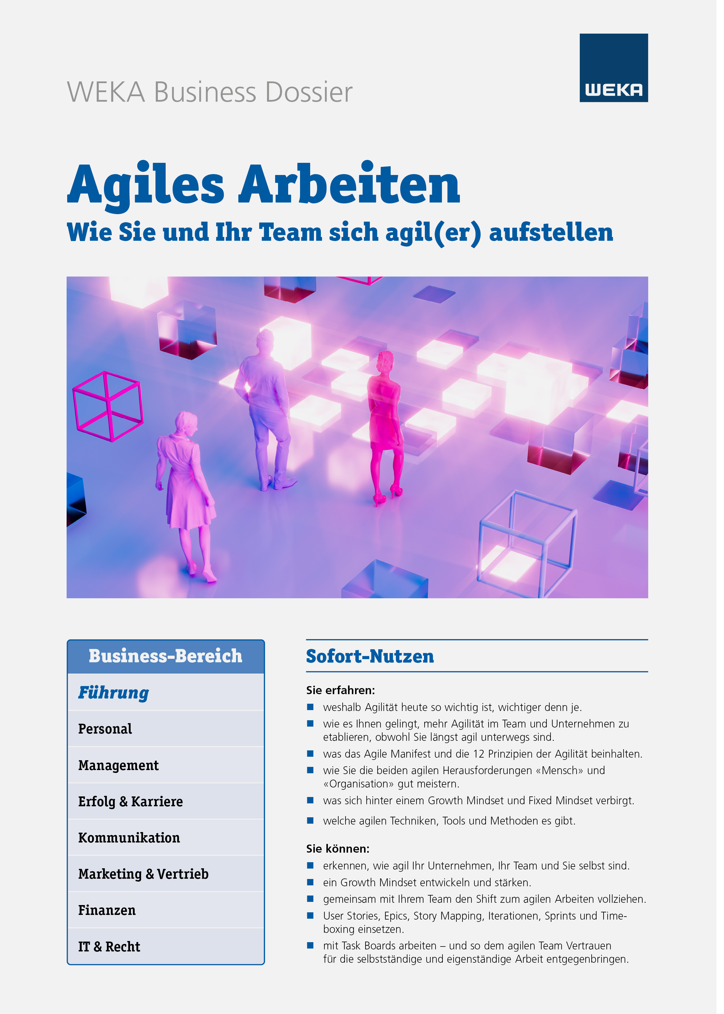 Globale Vernetzung, digitale Transformation und gesellschaftlicher Wandel verlangen von Unternehmen mehr Beweglichkeit als je zuvor. Dieses Dossier unterstützt Sie dabei, Agilität als Haltung, Kultur und Arbeitsweise zu verstehen – und Schritt für Schritt im Team zu verankern. Sie lernen die Werte und Prinzipien des Agilen Manifests kennen und verstehen, wie Growth Mindset und Fixed Mindset das Arbeiten prägen. Zudem erhalten Sie Impulse, wie Sie die beiden zentralen Herausforderungen „Mensch“ und „Organisation“ meistern. Praktische Tools wie Kanban, Design Thinking, User Stories, Iterationen, Task Boards oder Sprints werden ebenso vorgestellt wie Reflexionsübungen, die Sie und Ihr Team aktiv einbinden. So zeigt Ihnen dieses Dossier, wie Sie mehr Selbstorganisation erreichen, Kundenbedürfnisse in den Mittelpunkt rücken und Ihr Unternehmen zukunftsfähig aufstellen.