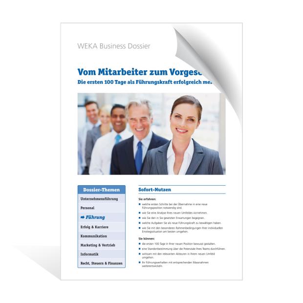 Profitieren Sie von Praxistipps, dem E-Dossier Vom Mitarbeiter zum Vorgesetzten und über 30 Arbeitshilfen für Ihre ersten 100 Tage als Führungskraft: