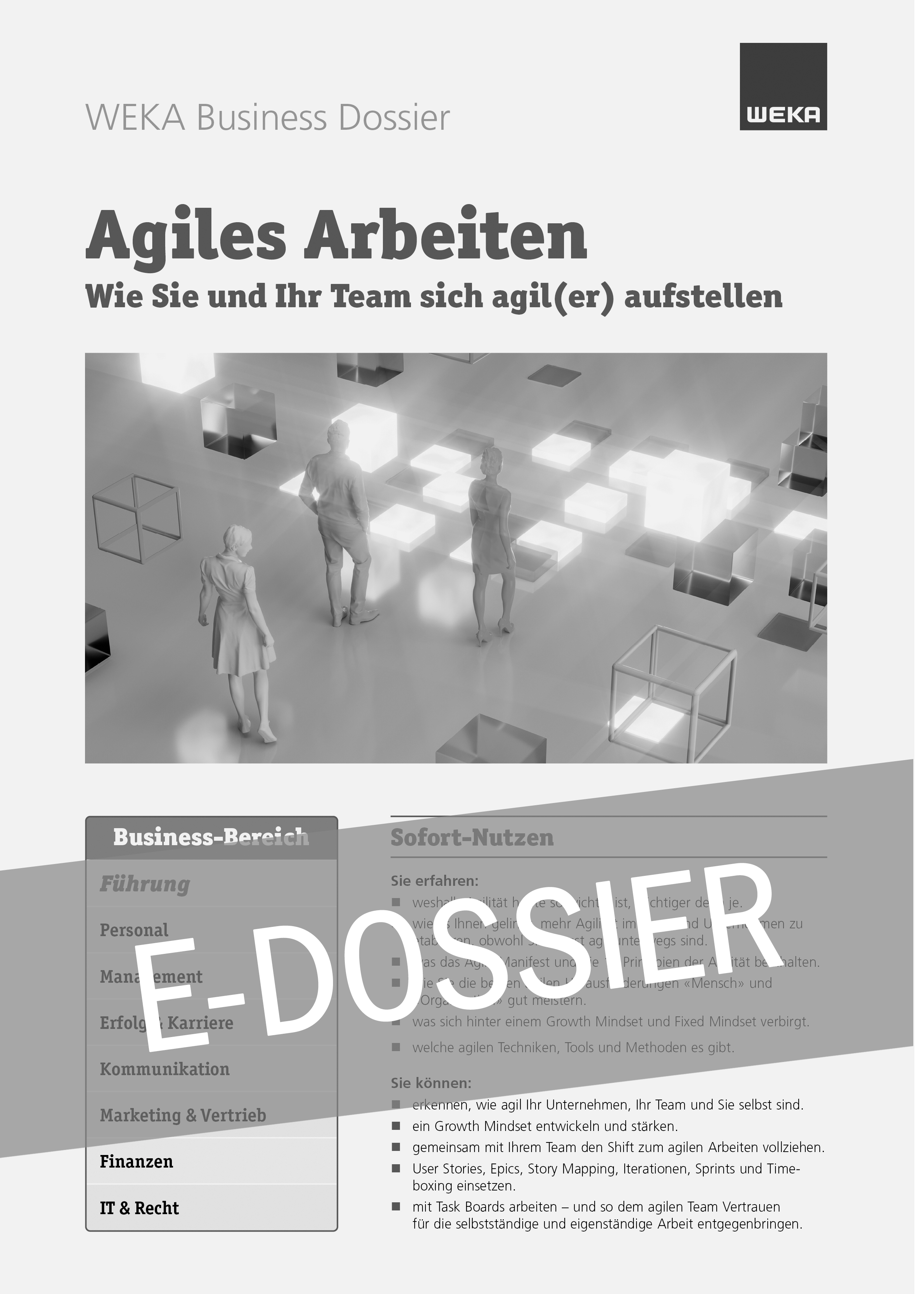 Globale Vernetzung, digitale Transformation und gesellschaftlicher Wandel verlangen von Unternehmen mehr Beweglichkeit als je zuvor. Dieses Dossier unterstützt Sie dabei, Agilität als Haltung, Kultur und Arbeitsweise zu verstehen – und Schritt für Schritt im Team zu verankern. Sie lernen die Werte und Prinzipien des Agilen Manifests kennen und verstehen, wie Growth Mindset und Fixed Mindset das Arbeiten prägen. Zudem erhalten Sie Impulse, wie Sie die beiden zentralen Herausforderungen „Mensch“ und „Organisation“ meistern. Praktische Tools wie Kanban, Design Thinking, User Stories, Iterationen, Task Boards oder Sprints werden ebenso vorgestellt wie Reflexionsübungen, die Sie und Ihr Team aktiv einbinden. So zeigt Ihnen dieses Dossier, wie Sie mehr Selbstorganisation erreichen, Kundenbedürfnisse in den Mittelpunkt rücken und Ihr Unternehmen zukunftsfähig aufstellen.