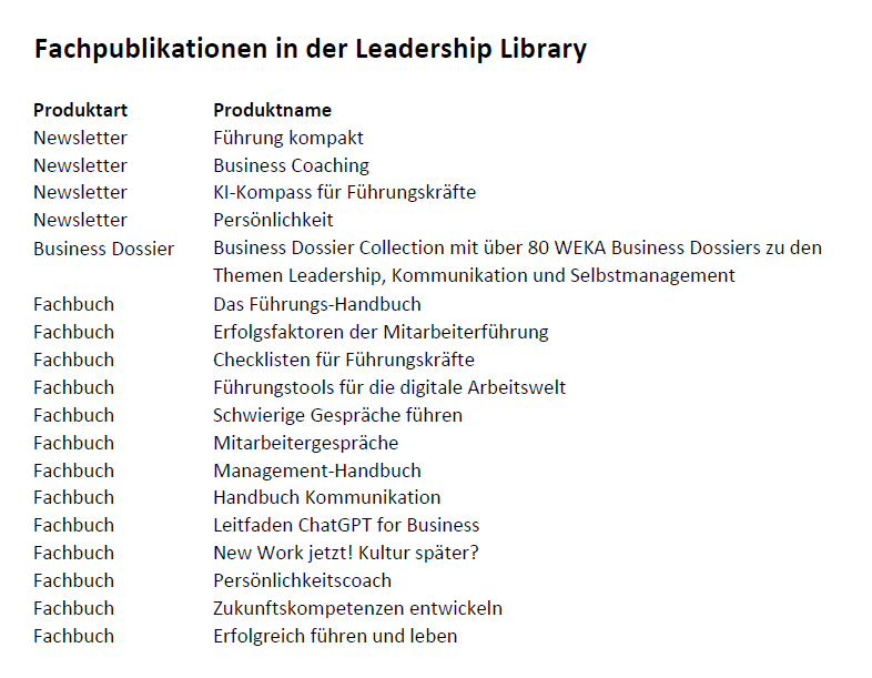 - Sie haben Online-Zugriff auf alle Fachpublikationen im Bereich Leadership (Newsletter, Fachbücher und Business Dossiers) mit über 100 praxisrelevanten Themen zu Mitarbeiterführung, Kommunikation und Selbstmanagement.