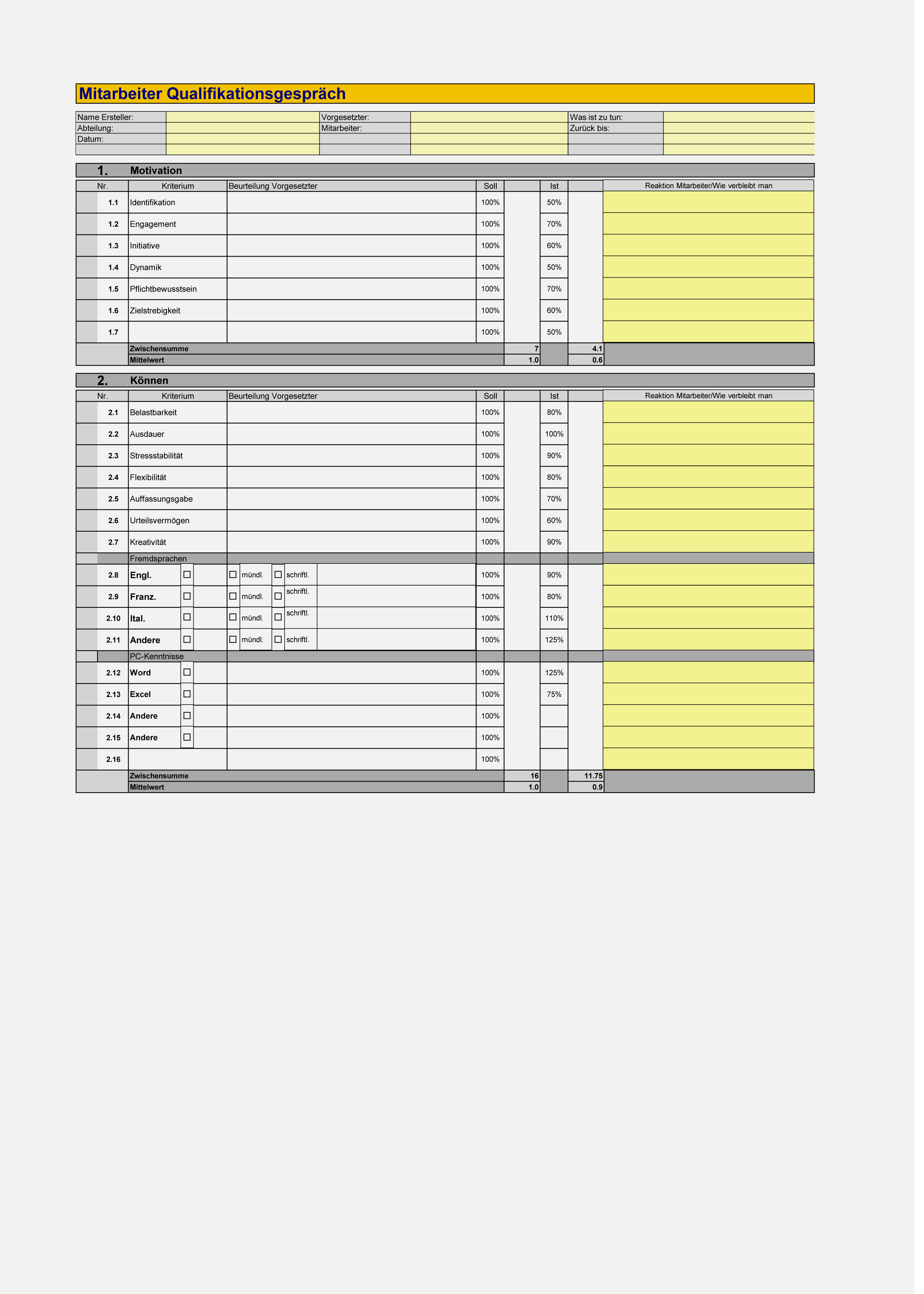 Das vorliegende Qualifikations-Formular ist ein klassischer Qualifikationsbogen, auf dem die Beurteilung im Soll-/Ist-Vergleich festgehalten wird. Die Resultate werden in Prozenten visualisiert und automatisch addiert. Verbale Beurteilungen können Sie in den dafür vorgegebenen Eintragsfeldern vornehmen. Ausserdem haben Sie die Möglichkeit die Texte individuell anzupassen.