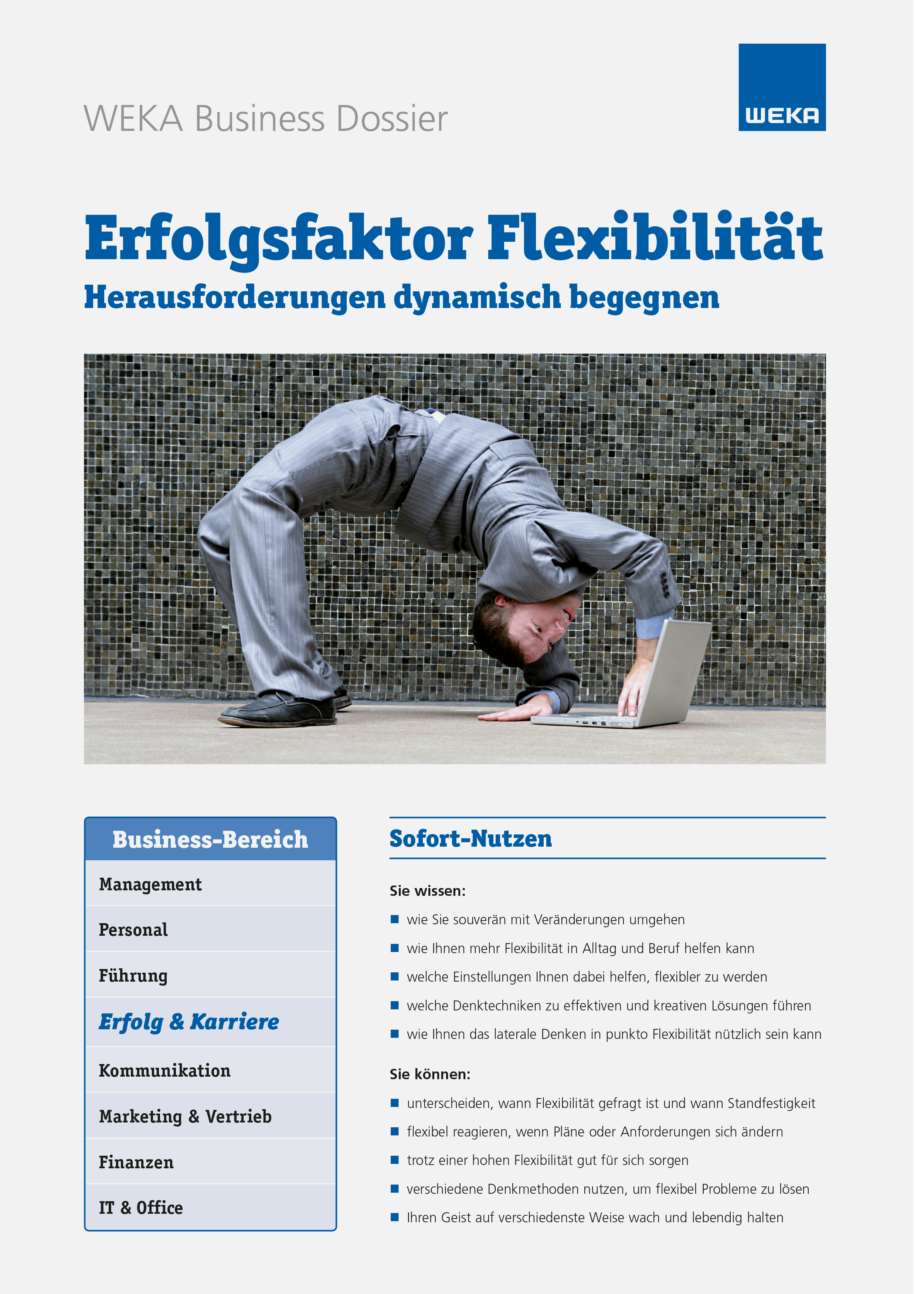 Unsere Zeit ist schnelllebig, neue Trends und Ideen entstehen genauso rasch wie veränderte Marktgegebenheiten und Wissensstände. Unsere Arbeitsumgebung, die Anforderungen in unserem Job, ja selbst unser normaler Alltag ist einem ständigen Wandel unterworfen. Flexibilität gilt als ein Schlüsselfaktor für den Erfolg und das gleichermassen für Unternehmen wie für Einzelpersonen. Mit diesem Dossier erhalten Sie einen Werkzeugkoffer, der konkretes und praktisches Wissen, Techniken und Methoden vermittelt, mit denen sich Flexibilität erhöhen und trainieren lässt.