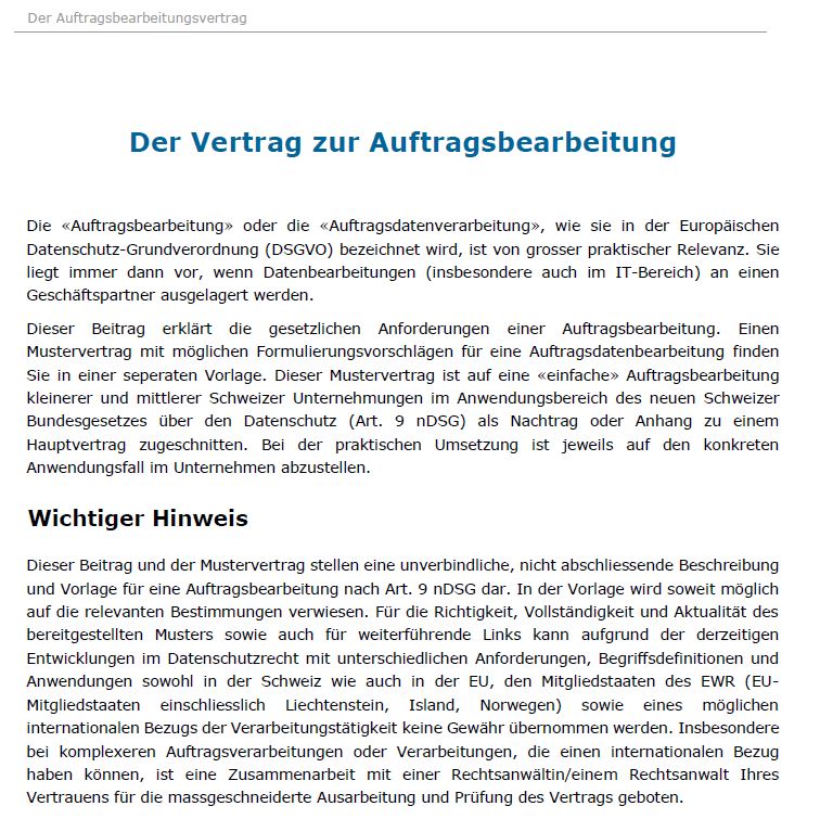 Profitieren Sie mit diesem Download-Paket von einem kurzen, erklärenden Beitrag über die gesetzlichen Anforderungen einer Auftragsbearbeitung sowie einem Mustervertrag mit möglichen Formulierungsvorschlägen für eine Auftragsdatenbearbeitung nach nDSG. Dieser Mustervertrag ist auf eine «einfache» Auftragsbearbeitung kleinerer und mittlerer Schweizer Unternehmungen im Anwendungsbereich des neuen Schweizer Bundesgesetzes über den Datenschutz (Art. 9 nDSG) als Nachtrag oder Anhang zu einem Hauptvertrag zugeschnitten.