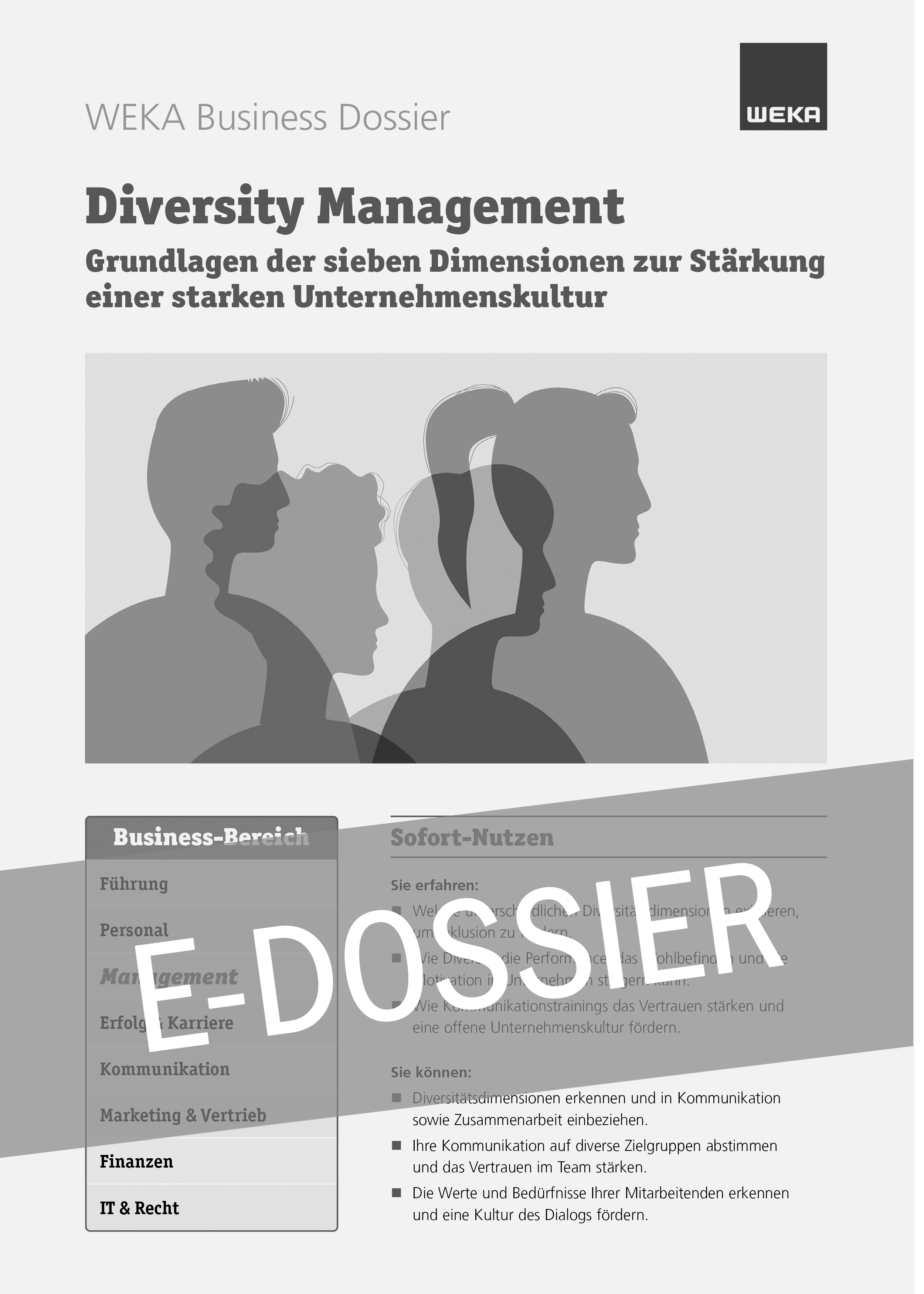 Braucht es Diversity Management für Firmen und Organisationen? Geht es bei Diversity nur um die Gender-Frage? Wo und wie starten wir mit dem Thema bei uns im Unternehmen? Warum wirken Firmen und Institutionen vertrauensvoller mit einer glaubwürdigen und transparenten Diversity-Unternehmensstrategie? Die oben genannten Fragestellungen sind nur einige, welche in Gesprächen mit CEOs, Führungskräften und Mitarbeitenden auftauchen. Diversity polarisiert. Das ist klar. Aber wofür steht Diversity genau? Und warum ist immer wieder die Rede von Inklusion? In diesem Business Dossier erhalten Sie einen Überblick über die sieben Dimensionen des Diversity Managements. Sie erfahren, dass Diversity weitaus mehr ist als nur die «Gender-Debatte». Es handelt sich hierbei um unterschiedliche Personengruppen, vielseitige Fähigkeiten und Facetten von Menschen in der Wirtschaft und unserer Gesellschaft.