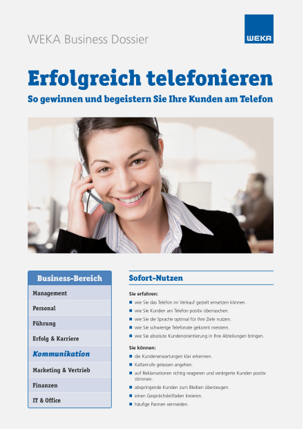 Ihre Mitarbeiter verraten am Telefon sehr viel über sich selbst, ob sie wollen oder nicht. In Kürze macht sich ein Kunde ein Bild darüber, ob er es mit einem engagierten, interessierten Ansprechpartner zu tun hat – und das innerhalb weniger Sekunden. Wagen Sie sich an die Herausforderung «Erfolgreich Telefonieren». Sie finden viele Denkanstösse und Praxistipps, wie Sie zusammen mit Ihren Mitarbeitern Ihren Kunden den optimalen Service bieten.