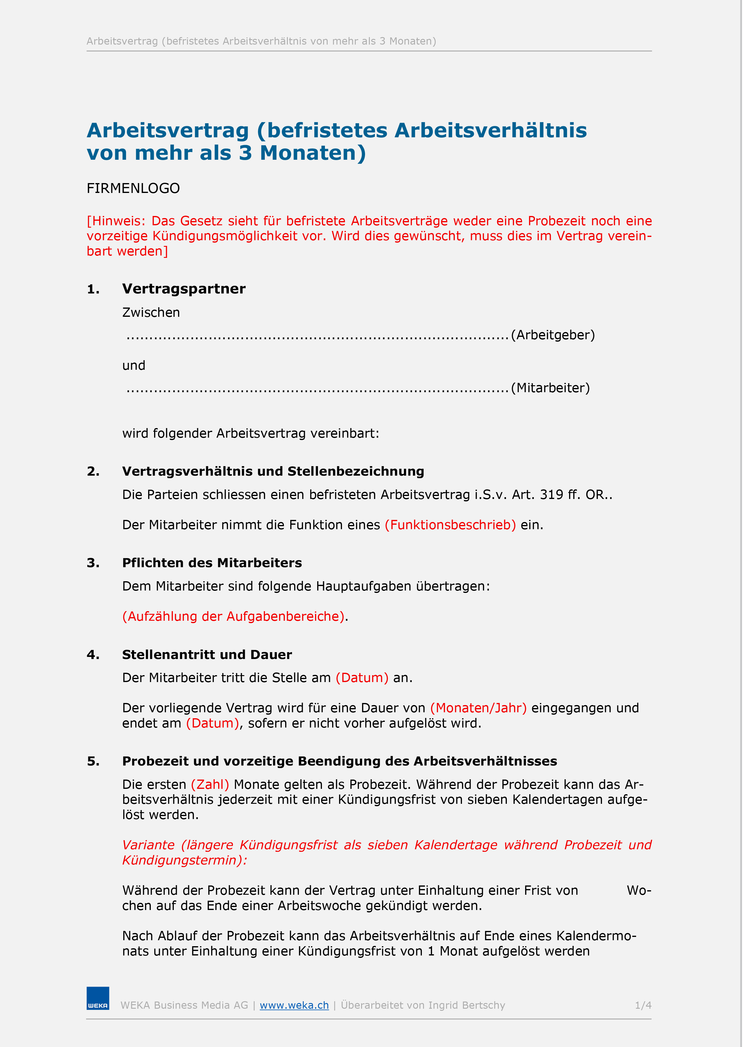 Ein Arbeitsverhältnis kann befristet abgeschlossen werden: Auf den vereinbarten Zeitpunkt hin endet das Arbeitsverhältnis, ohne dass es einer Kündigung bedarf. Im befristeten Arbeitsvertrag besteht ohne ausdrückliche Regelung weder eine Probezeit noch eine vorzeitige Kündigungsmöglichkeit. Der Vertrag muss also von beiden Parteien bis zum Beendigungstermin erfüllt werden.
