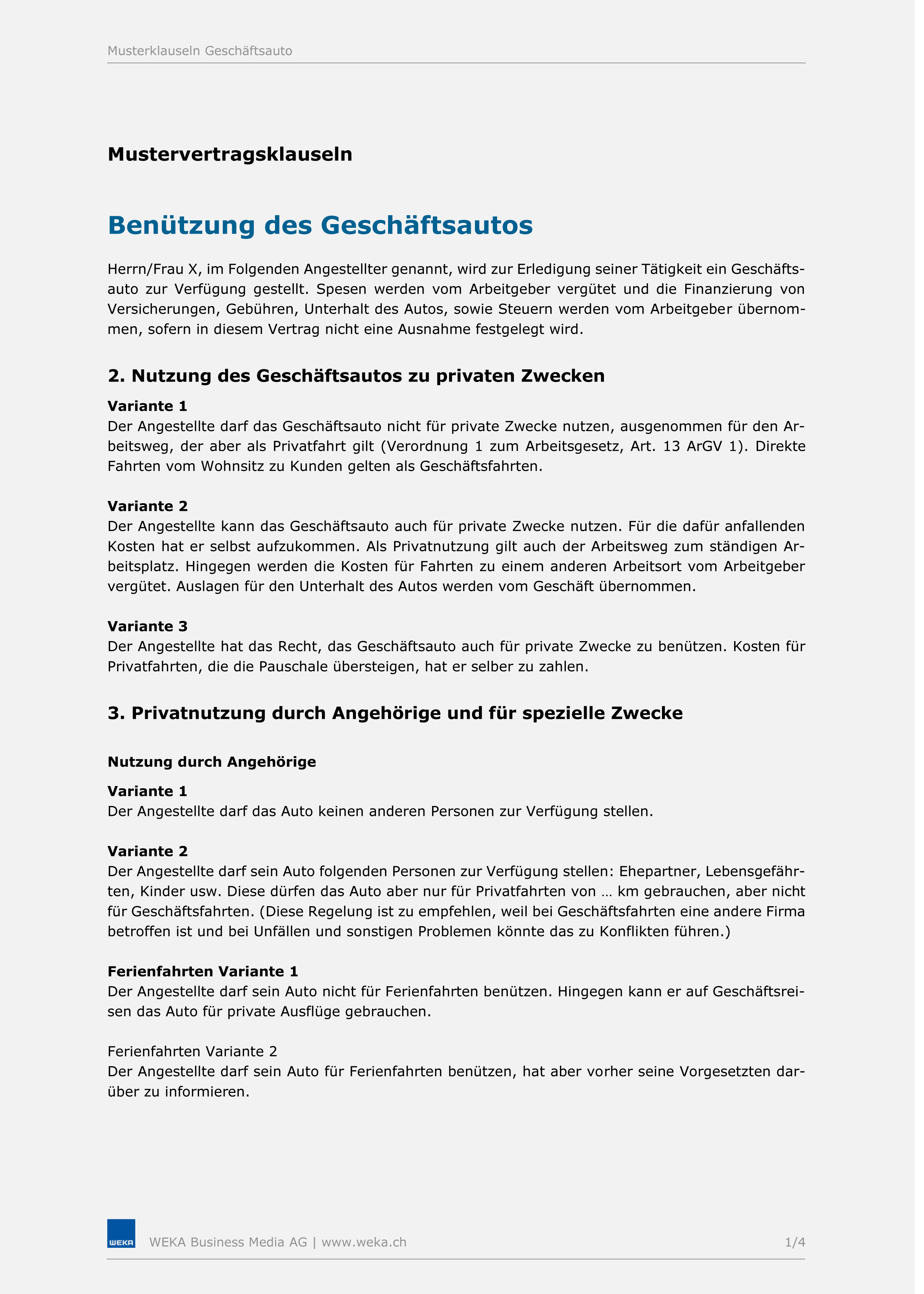 Als Geschäftsfahrzeug gelten nur Fahrzeuge, welche im Besitz der Firma sind oder von dieser geleast werden. Diese Arbeitshilfe liefert Ihnen verschiedene Musterklauseln für die Benutzung des Geschäftsautos durch die Mitarbeitenden.