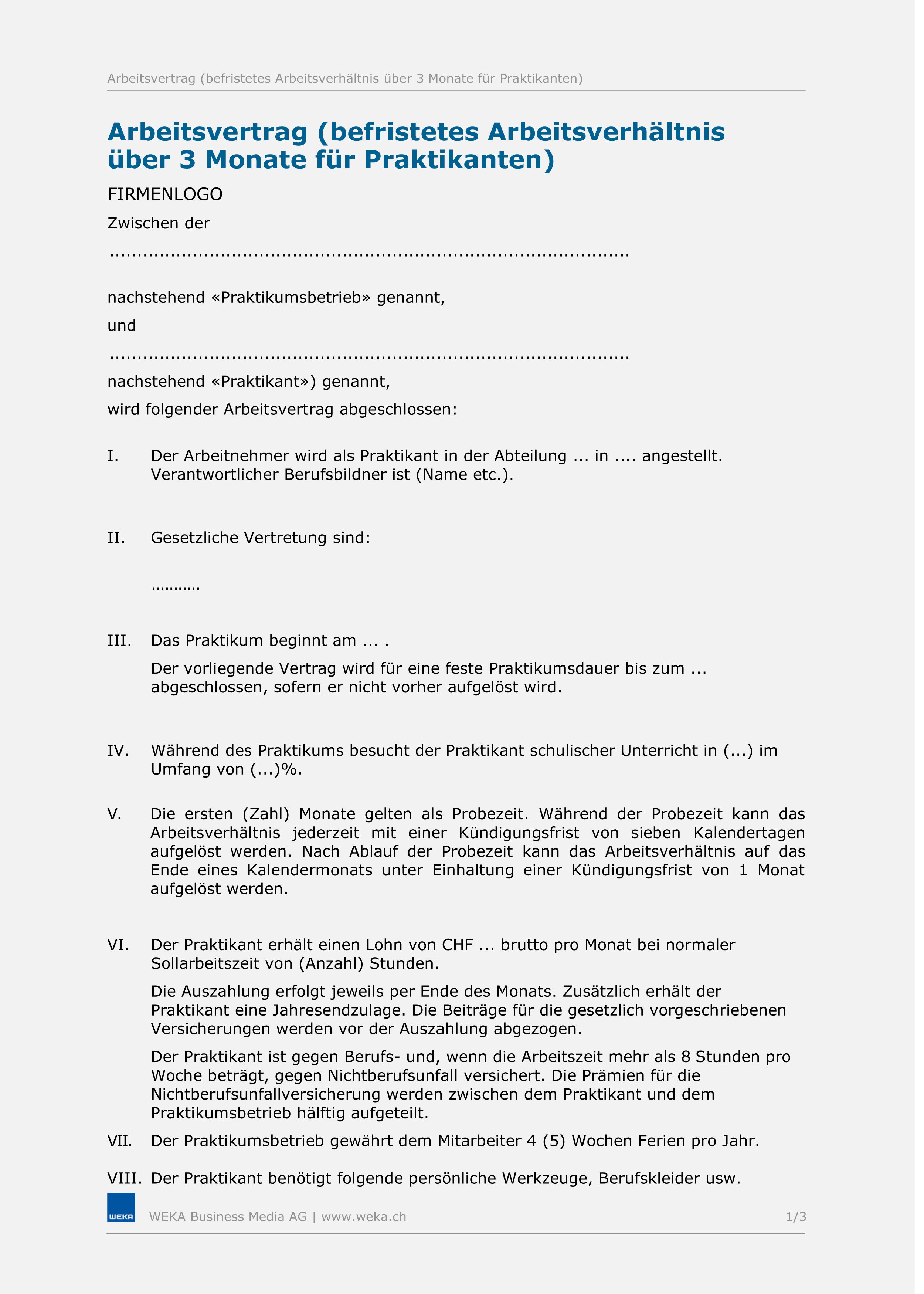 Praktikant/innen sind Lernende, welche während einer Ausbildung (z.B. Schule, Studium) eine beschränkte Zeit in einer Firma arbeiten, um die Praxis kennenzulernen und um einen Einblick in die Berufswelt zu gewinnen. Zudem sind so genannte Vorpraktika möglich, welche von Ausbildungsinstitutionen vorgeschrieben sind, um eine Ausbildung beginnen zu können. Mit dieser Mustervorlage regeln Sie das Arbeitsverhältnis für ein Praktikum.