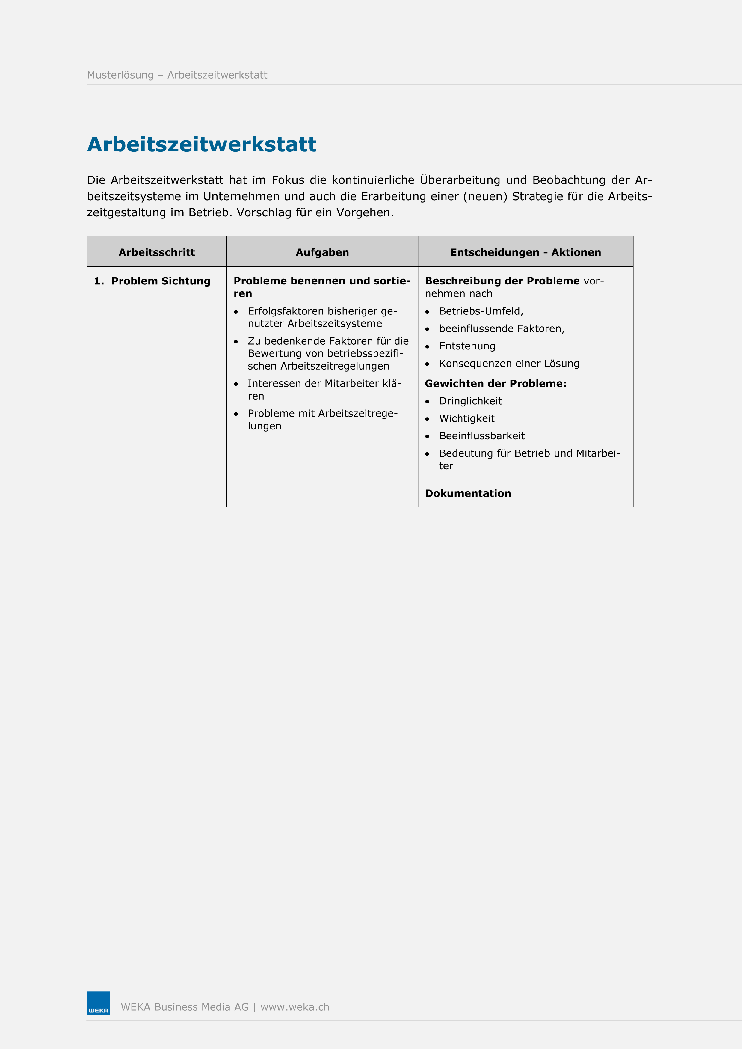 Die Arbeitszeitwerkstatt hat im Fokus die kontinuierliche Überarbeitung und Beobachtung der Arbeitszeitsysteme im Unternehmen und auch die Erarbeitung einer (neuen) Strategie für die Arbeitszeitgestaltung im Betrieb. Profitieren Sie von dieser Musterlösung als Vorschlag für Ihr Vorgehen.