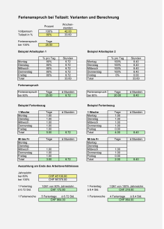 Dieser Excel-Rechner ermöglicht Ihnen eine leichte und korrekte Berechnung des Ferienanspruchs bei Teilzeitmitarbeitenden – dabei werden verschiedene Varianten und deren Berechnung berücksichtigt.