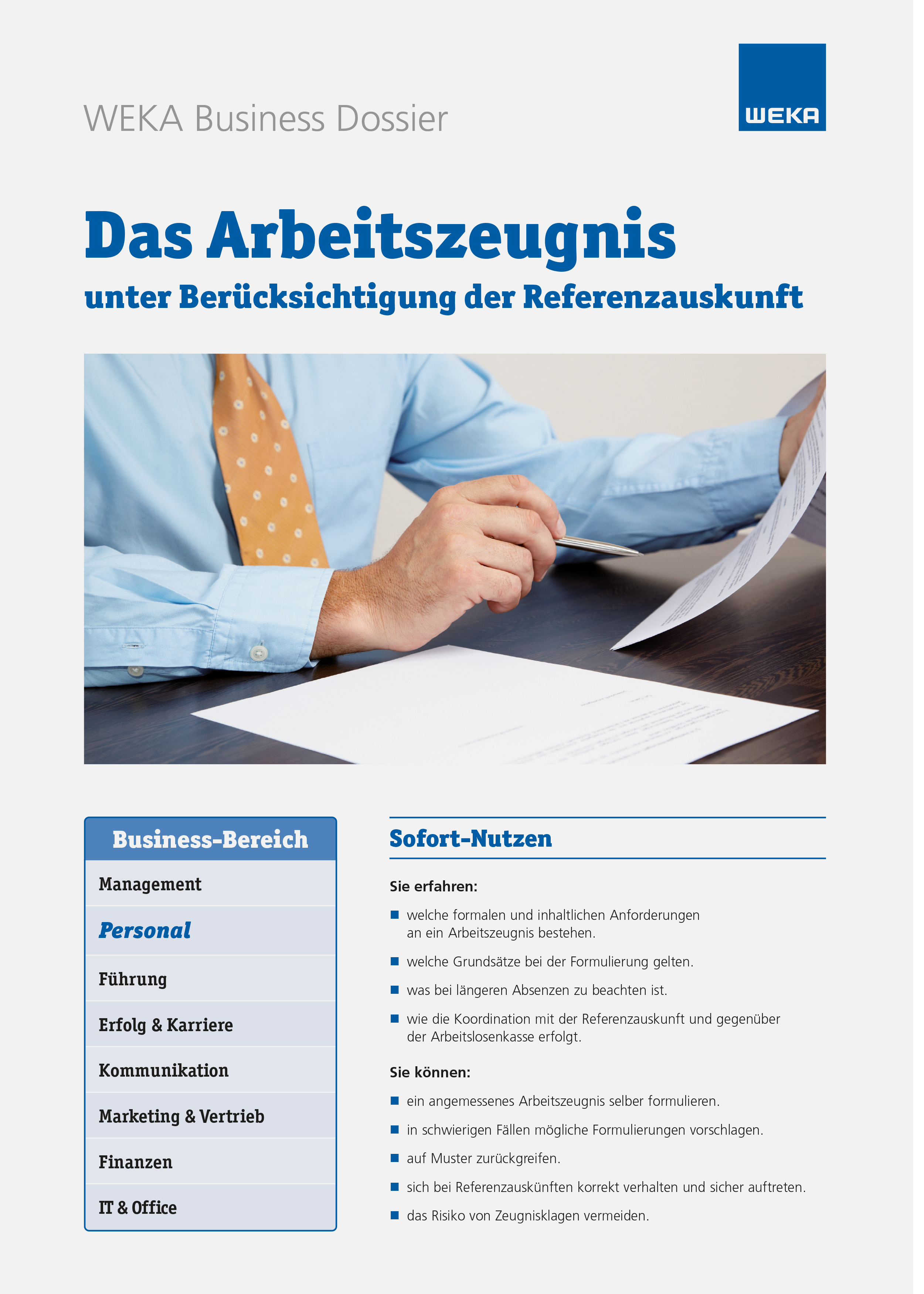 Aussagekräftige und korrekte Arbeitszeugnisse sind auf dem Stellenmarkt sowohl für Arbeitgeber wie auch für Arbeitnehmer unerlässlich. Doch welche Formulierungen und Codes sind unzulässig und wie verhält man sich im Streitfall? Mit diesem Business Dossier erhalten Sie alle Antworten dazu und profitieren von zahlreichen Formulierungshilfen, Praxistipps und wichtigen Hinweisen.
