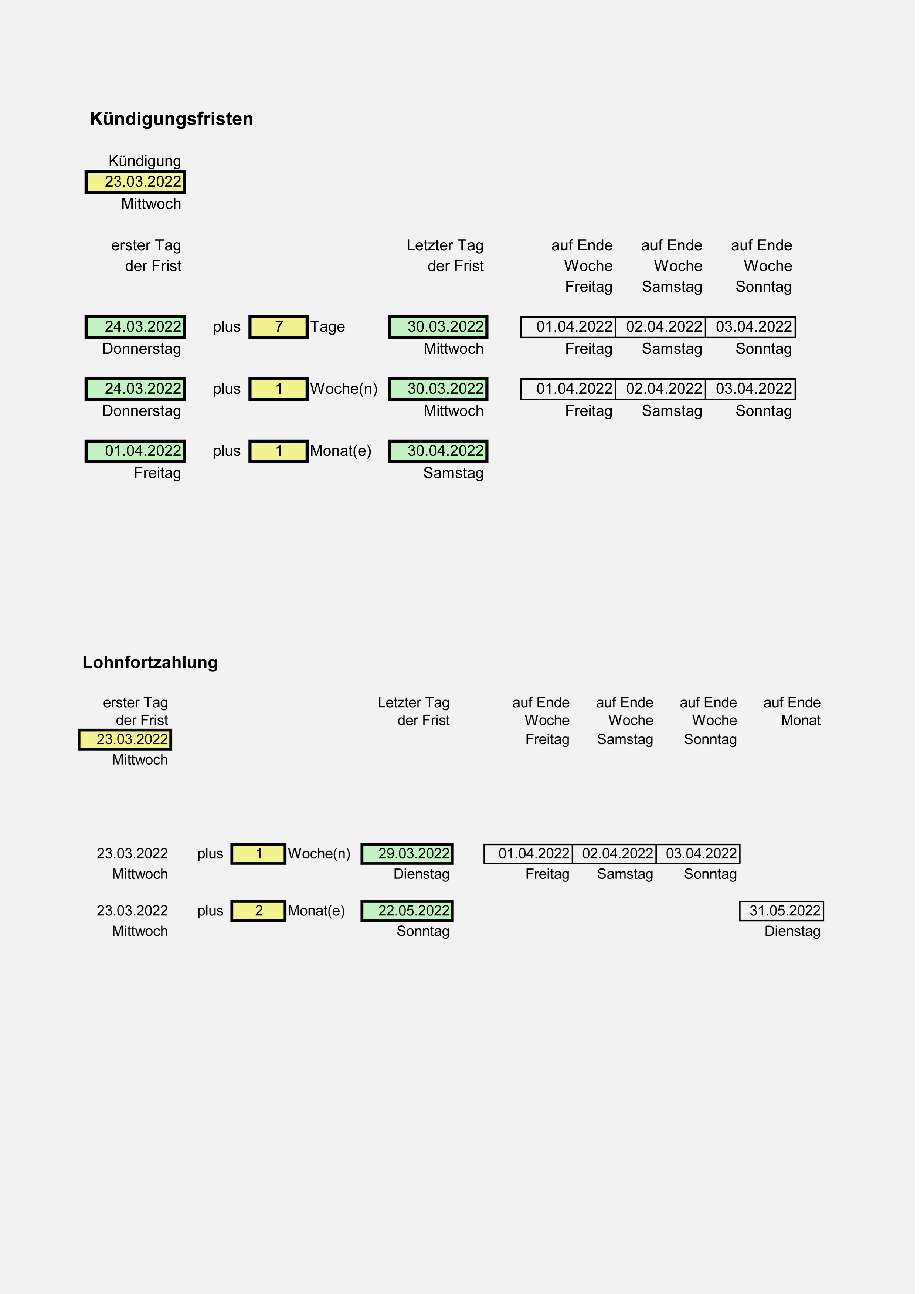 - Berechnung der Fristen wie Lohnfortzahlung, Kündigung oder Sperrfristen